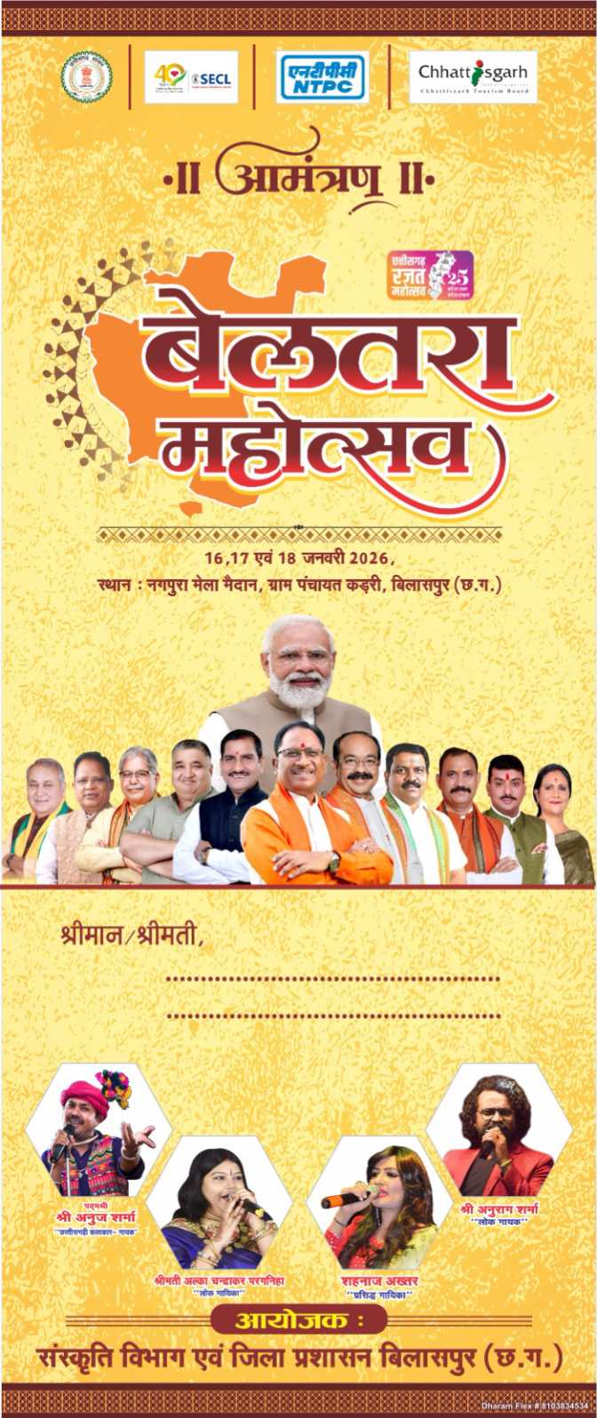 महोत्सव का भव्य शुभारंभ 16 जनवरी संस्कृति एवं पर्यटन मंत्री श्री राजेश अग्रवाल के मुख्य आतिथ्य में होगा। कार्यक्रम की अध्यक्षता बिलासपुर विधायक श्री अमर अग्रवाल करेंगे। विशिष्ट अतिथि के तौर पर बेलतरा श्री सुशांत शुक्ला, छत्तीसगढ़ पाठ्य पुस्तक निगम के अध्यक्ष श्री राजा पाण्डेय, जिला पंचायत अध्यक्ष श्री राजेश सूर्यवंशी सहित अन्य जनप्रतिनिधि एवं प्रशासनिक अधिकारी उपस्थित रहेंगे। सांस्कृतिक कार्यक्रमों की प्रस्तुति देने लोक गायक श्री चंदन यादव एवं लोक यायिका श्रीमती अल्का चन्द्राकर शामिल होंगी। महोत्सव के दूसरे दिन 17 जनवरी 2026 को सांस्कृतिक कार्यक्रमों की निरंतरता बनी रहेगी। कार्यक्रम में स्वास्थ्य मंत्री श्री श्याम बिहारी जायसवाल बतौर मुख्य अतिथि के रूप में शामिल होंगे। अध्यक्षता बिल्हा विधायक श्री धरम लाल कौशिक करेंगे। विशिष्ट अतिथि के रूप बेलतरा श्री सुशांत शुक्ला, क्रेडा अध्यक्ष श्री भूपेन्द्र सवन्नी, जिला सहकारी मर्यादित बैंक के अध्यक्ष सहित विभिन्न जनप्रतिनिधि उपस्थित रहेंगे। शाम 6 बजे से इस दिन मंच पर लोक गायक श्री अनुराग शर्मा एवं प्रसिद्ध गायिका शहनाज अख्तर अपनी प्रस्तुतियां देंगे।