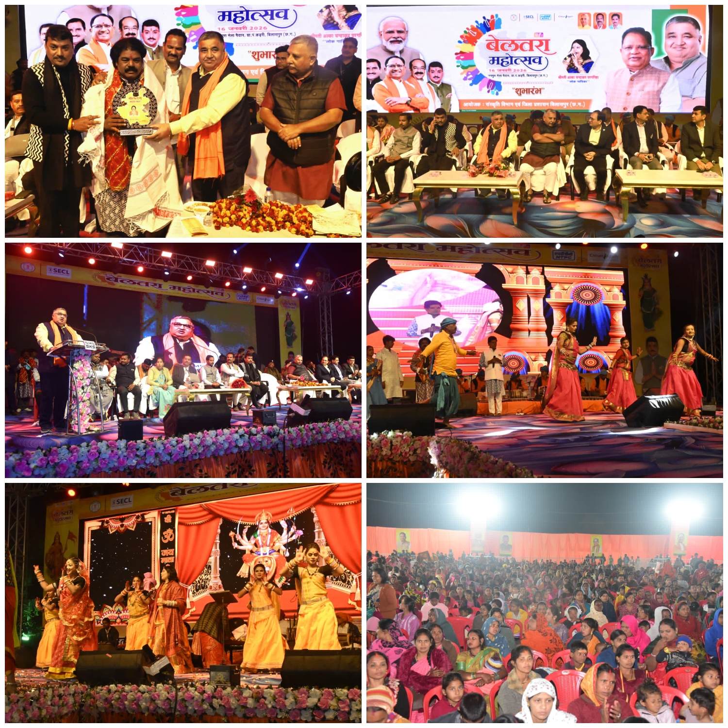 बिलासपुर :— संस्कृति विभाग द्वारा जिला प्रशासन के सहयोग से आयोजित तीन दिवसीय बेलतरा महोत्सव का शुभारंभ संस्कृति मंत्री राजेश अग्रवाल द्वारा किया गया। नगपुरा मेला मैदान में आयोजित भव्य शुभारंभ कार्यक्रम में संस्कृति मंत्री ने कहा कि छत्तीसगढ़ की लोक संस्कृति, परंपरा और सांस्कृतिक विरासत के संरक्षण के लिए राज्य सरकार प्रतिबद्ध है। कार्यक्रम की अध्यक्षता बिलासपुर विधायक श्री अमर अग्रवाल ने की और विशिष्ट अतिथि के रूप में बेलतरा विधायक सुशांत शुक्ला मौजूद रहे। छ.ग. पाठ्यपुस्तक निगम के अध्यक्ष राजा पाण्डेय, जिला पंचायत अध्यक्ष राजेश सूर्यवंशी, जनपद अध्यक्ष राम कुमार कौशिक सहित स्थानीय जनप्रतिनिधि, कलेक्टर संजय अग्रवाल, वरिष्ठ पुलिस अधीक्षक रजनेश सिंह , जिला पंचायत सीईओ संदीप अग्रवाल मौजूद रहे।
