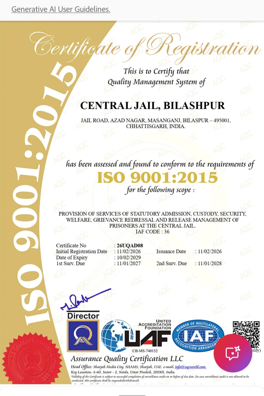 बिलासपुर :—उप मुख्यमंत्री एवं जेल विभाग के प्रभारी विजय शर्मा के निर्देशानुसार छत्तीसगढ़ की केंद्रीय जेलों में राष्ट्रीय एवं अंतरराष्ट्रीय मानकों के अनुरूप गुणवत्ता प्रबंधन प्रणाली स्थापित करने की दिशा में महत्वपूर्ण कदम उठाया गया है। इसी क्रम में केन्द्रीय जेल बिलासपुर सहित रायपुर, दुर्ग एवं अम्बिकापुर को आईएसओ 9001 : 2015 प्रमाणन प्रदान किया गया है।