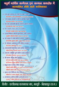 छत्तीसगढ़ कलमकार मंच मस्तूरी-बिलासपुर की प्रबन्धकारिणी समिति द्वारा लिए गए निर्णय अनुसार 22 फरवरी 2026 को छत्तीसगढ़ कलमकार मंच का चतुर्थ वार्षिक अधिवेशन हॉटल सेफ्रॉन, टेलीफोन एक्सचेंज रोड बिलासपुर में सम्पन्न होगा। यह कार्यक्रम श्री राजेन्द्र रंजन गायकवाड़ वरिष्ठ साहित्यकार एवं पूर्व केन्द्रीय जेल अधीक्षक, छत्तीसगढ़ शासन के मुख्य आतिथ्य, श्री मंगत रवीन्द्र वरिष्ठ साहित्यकार की अध्यक्षता तथा श्री रामनाथ साहू वरिष्ठ साहित्यकार के विशिष्ट आतिथ्य में सम्पन्न होगा।