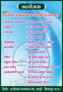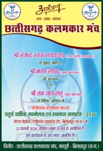उक्त जानकारी छत्तीसगढ़ कलमकार मंच के संस्थापक-अध्यक्ष डॉ. किशन टण्डन क्रान्ति साहित्य वाचस्पति, उपाध्यक्ष श्री जुगेश बंजारे धीरज, सचिव श्री नवीन कुमार कुर्रे तथा प्रचार सचिव श्री मणिशंकर दिवाकर ‘गदगद’ द्वारा संयुक्त रूप से दी गई है।