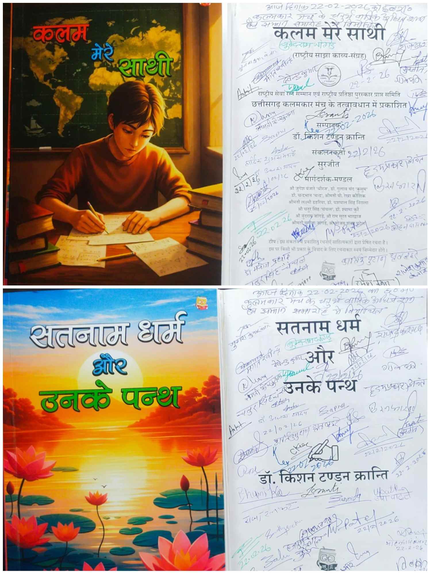 वार्षिक सम्मान समारोह में तीन पुस्तकों का विमोचन हुआ। इन पुस्तकों में डॉ. किशन टण्डन क्रान्ति द्वारा सम्पादित राष्ट्रीय साझा काव्य संकलन- “कलम मेरे साथी” शामिल रहे। इसमें 64 साहित्यकारों के जीवन परिचय एवं उनकी श्रेष्ठ रचनाओं का संकलन है। इसके अलावा डॉ. किशन टण्डन क्रान्ति द्वारा लिखी गई 74 वीं कृति- सतनाम धर्म और उनके पन्थ” तथा 75वीं कृति “सतनाम प्रकाश” का विमोचन भी करतल ध्वनि के बीच सम्पन्न हुआ।