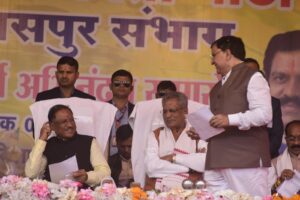 बिलासपुर ·//· भाजपा का संभाग स्तरीय कार्यकर्ता अभिनंदन समारोह पुलिस परेड मैदान बिलासपुर में संपन्न हुआ । समारोह में मुख्यमंत्री विष्णु देव साय,प्रदेश प्रभारी ओम माथुर,भाजपा के प्रदेश अध्यक्ष किरण देव, उपमुख्यमंत्री अरुण साव, विजय शर्मा सहित भाजपा के वरिष्ठ पदाधिकारी उपस्थित थे। सबने भाजपा के सभी जिलों के जिला अध्यक्ष,मंडल अध्यक्ष सहित कार्यकर्ताओं का पुष्प वर्षा से अभिनंदन किया ।इस अवसर पर बिल्हा विधानसभा क्षेत्र के पथरिया मंडल के अंतर्गत विभिन्न ग्रामों के जोगी कांग्रेस व कांग्रेस के लगभग दो दर्जन कार्यकर्ताओं ने भाजपा में प्रवेश किया ।