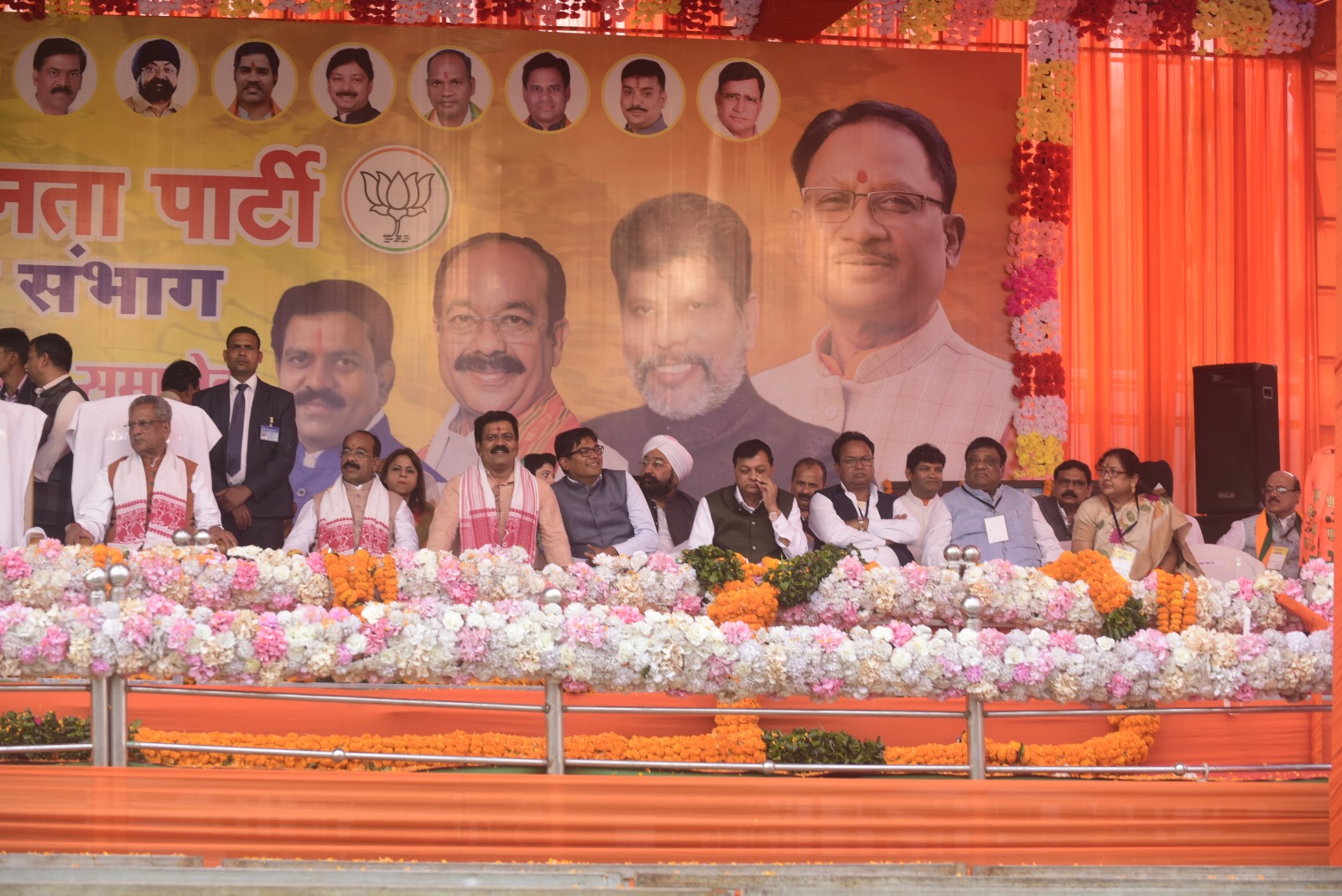 समारोह को संबोधित करते हुए मुख्यमंत्री विष्णु देव साय ने कहा की प्रभारी ओम माथुर के मार्गदर्शन में छत्तीसगढ़ में भाजपा की जीत हुई है। 46% से ज्यादा वोट बीजेपी को विधानसभा चुनाव में प्राप्त हुआ है। समाज के सभी वर्गों का सहयोग हमें मिला है ।उन्होंने कहा कि अभी सरकार को एक महीने भी पूरे नहीं हुए हैं और हम मोदी जी की गारंटी के बड़े वादों को पूरा कर लिए हैं ।उन्होंने कहा कि राज्य कैबिनेट की प्रथम बैठक में 18 लाख गरीब लोगों को आवास स्वीकृत किया है ।हमने 2 साल का बकाया बोनस भी अटल जयंती पर किसानों को दिया। राज्य के 12 लाख से ज्यादा किसानों को 3716 करोड़ से ज्यादा का बोनस उनके खाते में अंतरित किया गया। मुख्यमंत्री ने कहा कि छत्तीसगढ़ पीएससी ने पिछले साल हमारे मेहनतकश बेटा बेटियों के साथ खिलवाड़ किया था। इसकी सीबीआई जांच की अनुशंसा हमने कर दी है ।उन्होंने महतारी वंदन योजना के अंतर्गत भी जल्द ही एक हजार रुपए विवाहित महिलाओं के खाते में डाले जाने की जानकारी दी। मुख्यमंत्री ने कहा कि 3100 के भाव में धान का दाम मिलेगा ।यह राशि किसानों को एक मुश्त मिलेगी ।श्री साय ने कहा कि मोदी की गारंटी के एक-एक वादे हम अपने कार्यकाल में पूरा करेंगे ।उन्होंने कार्यकर्ताओं को सभी 11 सीटों को जीतकर मोदी के प्रति आभार व्यक्त करने की अपील की।