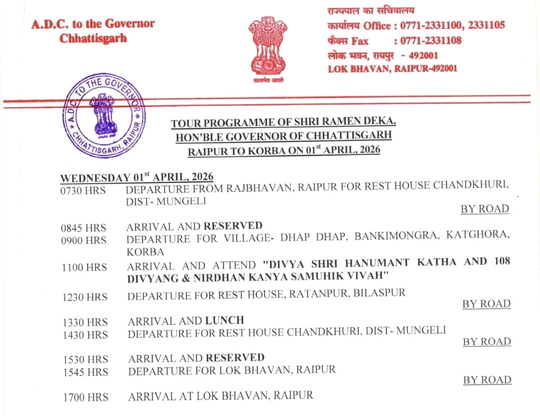 बिलासपुर // राज्यपाल रमेन डेका आज 1 अप्रैल को कोरबा और बिलासपुर जिले के दौरे पर रहेंगे। निर्धारित कार्यक्रम के अनुसार श्री डेका रायपुर लोकभवन से सवेरे 7.30 बजे सड़क मार्ग द्वारा मुंगेली जिले के चंदखुरी विश्राम गृह के लिए प्रस्थान करेंगे। इसके बाद राज्यपाल सुबह 9 बजे कोरबा जिले के कटघोरा क्षेत्र अंतर्गत ग्राम ढपढप बांकीमोंगरा के लिए रवाना होंगे। यहां वे प्रातः 11 बजे आयोजित “दिव्य श्री हनुमंत कथा एवं 108 दिव्यांग एवं निर्धन कन्याओं के सामूहिक विवाह” कार्यक्रम में शामिल होंगे। कार्यक्रम के पश्चात राज्यपाल श्री डेका दोपहर 12:30 बजे रतनपुर (बिलासपुर) स्थित विश्राम गृह के लिए प्रस्थान करेंगे, जहां दोपहर 1:30 बजे आगमन निर्धारित है। इसके बाद वे दोपहर 2:30 बजे पुनः चंदखुरी जिला मुंगेली के लिए रवाना होंगे। दोपहर 3:30 बजे चंदखुरी पहुंचने के बाद अल्प विश्राम करेंगे और शाम 3:45 बजे रायपुर स्थित लोक भवन के लिए प्रस्थान करेंगे।राज्यपाल शाम 5 बजे लोक भवन, रायपुर पहुंचेंगे।