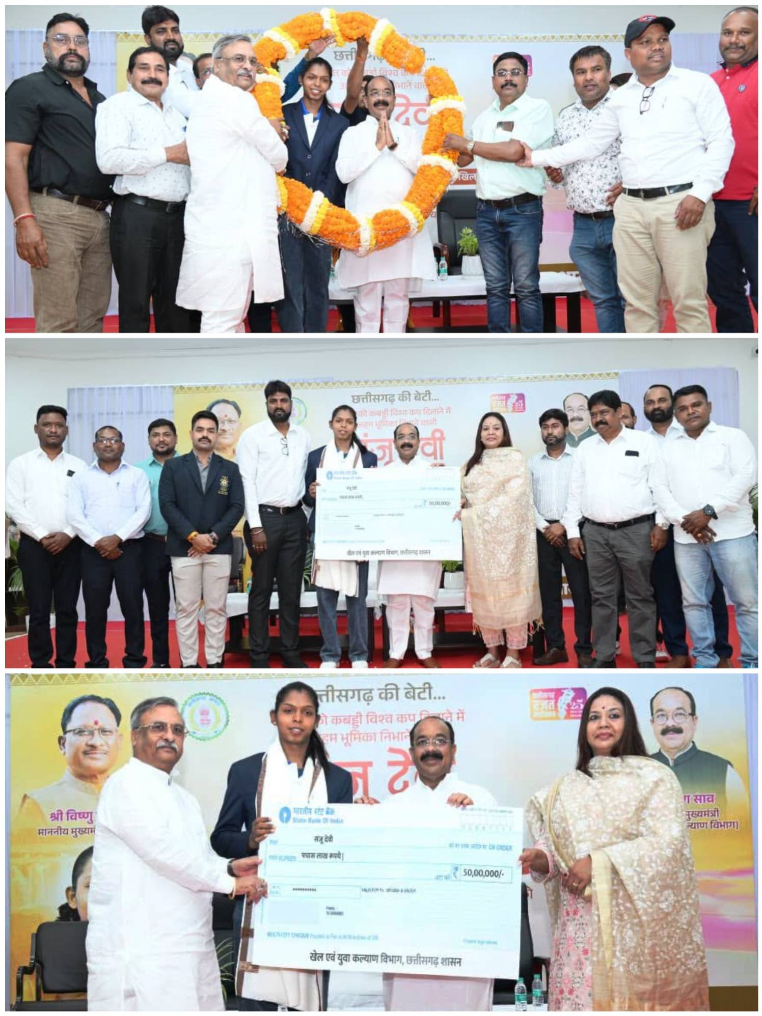 बिलासपुर :— भारत को कबड्डी विश्वकप और एशियन चैंपियनशिप दिलाने में अहम भूमिका निभाने वाली संजू देवी को राज्य शासन के खेल एवं युवा कल्याण विभाग द्वारा 50 लाख रुपए की प्रोत्साहन राशि प्रदान की गई है। छत्तीसगढ़ में पहली बार किसी खिलाड़ी को इतनी बड़ी प्रोत्साहन राशि दी गई है। उप मुख्यमंत्री तथा खेल एवं युवा कल्याण मंत्री अरुण साव ने नवा रायपुर स्थित अपने निवास कार्यालय में आयोजित सम्मान समारोह में उन्हें यह राशि सौंपी। श्री साव ने इस दौरान बिलासपुर के चिंगराजपारा कबड्डी क्लब को कबड्डी मैट भी प्रदान किया।