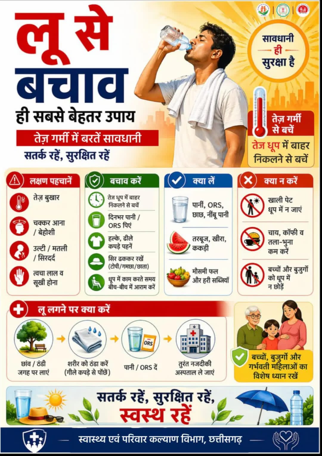 राष्ट्रीय जलवायु परिवर्तन एवं मानव स्वास्थ्य कार्यक्रम के तहत जारी निर्देशों में कहा गया है कि प्रदेश में तापमान में लगातार वृद्धि हो रही है, जिससे लू (हीट स्ट्रोक) की संभावना बढ़ गई है। ऐसी स्थिति में जनस्वास्थ्य पर प्रतिकूल प्रभाव पड़ सकता है, इसलिए समय रहते सतर्कता और बचाव अत्यंत आवश्यक है। जारी दिशा-निर्देशों के अनुसार लू के प्रमुख लक्षणों में सिरदर्द, तेज बुखार, चक्कर आना, उल्टी, शरीर में दर्द, अत्यधिक गर्मी के बावजूद पसीना न आना, अत्यधिक प्यास लगना, पेशाब कम आना तथा बेहोशी शामिल हैं। इन लक्षणों को नजरअंदाज न करते हुए तुरंत आवश्यक कदम उठाने की सलाह दी गई है।