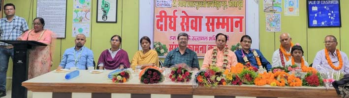 प्रशासनिक भवन के कान्फ्रेन्स हाल में आयोजित सम्मान में समारोह में मुख्य अतिथि डॉ. हेमंत सचदेवा, मुख्य अभियंता एवं अतिरिक्त मुख्य अभियंता, अंजना कूजुर, राजेश्वरी रावत एवं एलएन सूर्यवंशी उपस्थित थे। डॉ. सचदेवा एवं मंचस्थ अतिथियों ने सेवानिवृत्ति कर्मी को पुष्पगुच्छ, प्रशस्ति पत्र, कलाई घड़ी, प्रदान कर सम्मानित किया। डॉ. सचदेवा ने कहा कि सेवानिवृत्त हो रहे सभी अधिकारी-कर्मचारियों ने अपने कार्य को निष्ठा एवं लगन से करते हुये संयंत्र की सेवा की है। उन्होंने कहा कि आपका अनुभव, अनुशासन एवं संयंत्र में कार्य करने की शैली सैदव हम सभी को अविस्मरणीय रहेगी। एसएस कंवर कल्याण अधिकारी द्वारा कार्यक्रम का संचालन एवं नीलम शर्मा, कार्यपालन अभियंता द्वारा सेवानिवृत्त हो रहे कर्मियों का संक्षिप्त परिचय दिया। अभार प्रदर्शन आर.पी. टण्डन, अधीक्षण अभियंता (मुख्यालय) के द्वारा किया गया। कार्यक्रम को सफल बनाने में एसके डेविड, महिपाल कैवर्त एवं राजकुमार केंवट का सहयोग रहा।