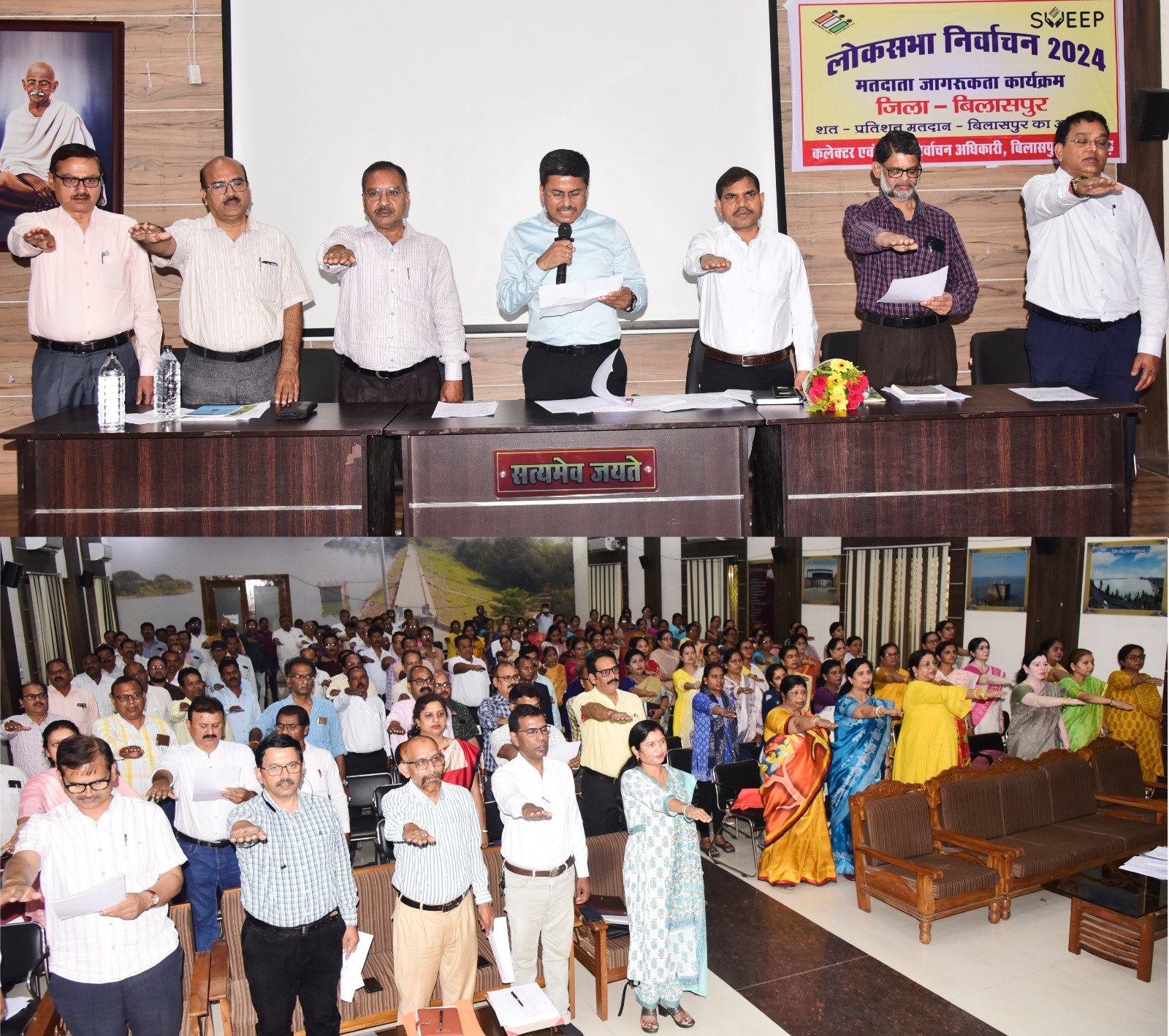 कलेक्टर एवं जिला निर्वाचन अधिकारी अवनीश शरण ने बैठक में मौजूद सभी लोगों को लोकसभा निवार्चन सहित अन्य निर्वाचनों में अपने मताधिकार का शत प्रतिशत उपयोग करने की शपथ दिलाई।