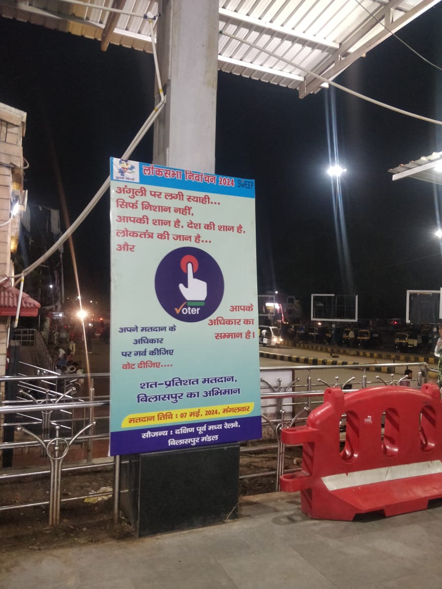 बिलासपुर // लोकसभा निर्वाचन सहित सभी निर्वाचनों में शत प्रतिशत मतदान के उद्देश्य को पूर्ण करने जिले में विभिन्न विभागों एवं सामाजिक संगठनों द्वारा स्वीप के अंतर्गत सत्त रूप से मतदाता जागरूकता अभियान चलाया जा रहा है। इसी कड़ी में बिलासपुर रेल्वे विभाग द्वारा रेल्वे स्टेशन, रेल्वे आवसीय परिक्षेत्र में लगातार मतदाता जागरूकता संबंधित होर्डिंग्स, फ्लैक्स लगाये जा रहे हैं। इसके अतिरिक्त रेल्वे स्टेशन में रेल्वे एनाउन्समेंन्ट सिस्टम एवं स्टेशन में लगे एलईडी के माध्यम से मतदाता जागरूकता के लिए ऑडियो एवं वीडियो संदेश प्रसारित किये जा रहे है। लोगों को 7 मई को लोकसभा चुनाव में शत प्रतिशत मतदान करने प्रेरित किया जा रहा है।