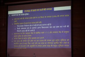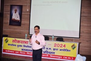 प्रशिक्षण में मास्टर ट्रेनर द्वारा मतगणना के पूर्व तैयारी, मानव संसाधन एवं अन्य जरूरी संसाधनों की व्यवस्था, डाक मतपत्र की गणना, इव्हीएम से मतगणना की व्यवस्था, इंडेक्स कार्ड भरने की व्यवस्था सहित अन्य महत्वपूर्ण विषयों पर जानकारी दी गई। मतगणना दिवस के दिन स्ट्रांग रूम एवं मतगणना कक्ष में अपेक्षित नियमों के बारे में बताया गया। डाक मतपत्र एवं कंट्रोल यूनिट के मतों की काउंटिंग की प्रक्रिया को सरलता से समझाया गया। सबसे पहले डाक मतपत्र एवं इटीपीबीएस की मतों की गणना की जाएगी। मास्टर ट्रेनर द्वारा प्रशिक्षणार्थियों की जिज्ञासाओं को भी शांत किया गया। प्रशिक्षण में नगर निगम कमिश्नर अमित कुमार, एडीएम आरए कुरूवंशी, उप जिला निर्वाचन अधिकारी शिवकुमार बनर्जी, मुंगेली जिले की एडीशनल कलेक्टर निष्ठा पाण्डेय तिवारी, जिला स्तरीय मास्टर ट्रेनर एमटी आलम, सभी सहायक रिटर्निंग ऑफिसर सहित उन्हें सहायक मौजूद थे।