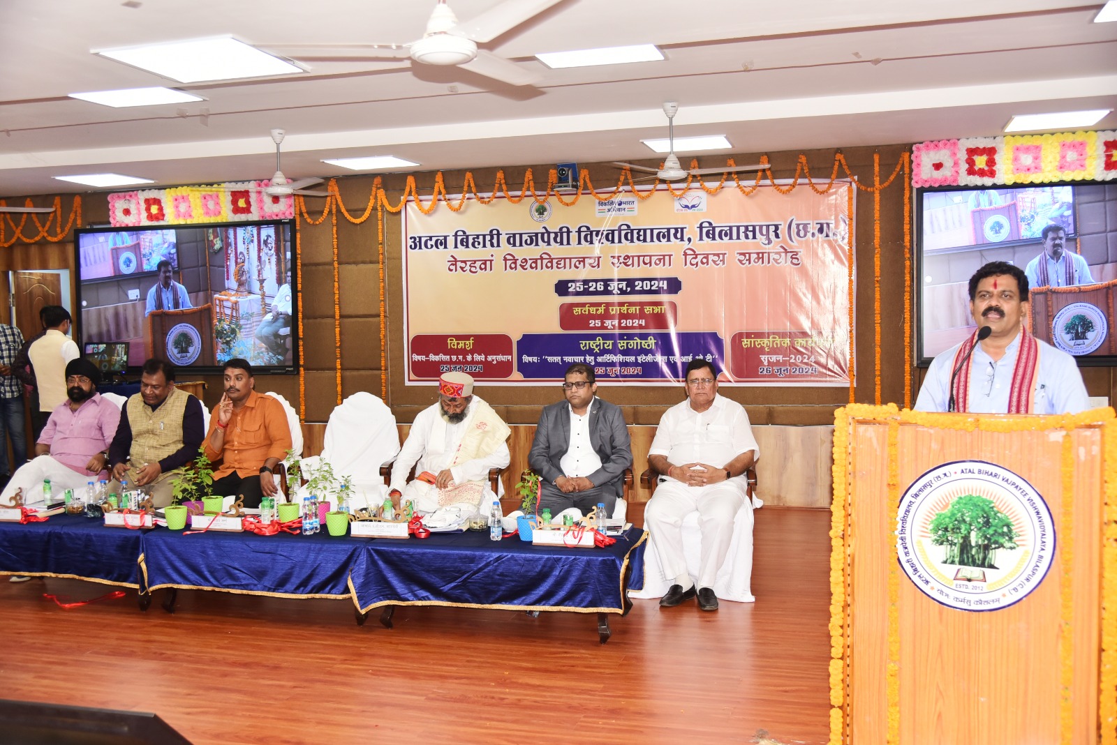 कार्यक्रम को संबोधित करते हुए बेलतरा विधायक सुशांत शुक्ला ने कहा कि अल्पसमय में ही यूनिवर्सिटी ने शिक्षा जगत मेें अपनी विशेष पहचान बनाई है। किसी भी संस्थान के विकास में तेरह वर्ष का समय ज्यादा नहीं होता है लेकिन बावजूद इसके यूनिवर्सिटी ने नई उंचाईयों को छूआ है। उन्होंने उप मुख्यमंत्री से बिलासपुर में फायर स्टेशन सहित कोनी में बेरोजगार युवाओं के लिए सेना में भर्ती के लिए प्रशिक्षण केन्द्र की मांग की जिसमें युवाओं को सेना में भर्ती के लिए मार्गदर्शन मिल सके। कुलपति एडीएन बाजपेई ने स्वागत भाषण एवं प्रतिवेदन प्रस्तुत किया। उन्होंने बताया कि स्थापना दिवस समारोह के अवसर पर सर्वधर्म प्रार्थना सभा यूनिवर्सिटी में आयोजित की गई। इसके अलावा सतत नवाचार हेतु आर्टिफिशियल इंटेलीजेन्स एवं आई.ओ.टी. पर राष्ट्रीय संगोष्ठी भी आयोजित की जा रही है। उन्होंने तुलसी का पौधा भेंट कर अतिथियों का स्वागत किया। इस अवसर पर उन्होंने विश्वविद्यालय की शैक्षणिक एवं अन्य क्षेत्रों में विशिष्ट उपलब्धियों की जानकारी से समारोह को अवगत कराया। कुलसचिव शैलेन्द्र दुबे ने आभार ज्ञापन किया। कार्यक्रम में नंद कुमार पटेल विश्वविद्यालय के कुलपति एल पी पटेल, हेमचंद यादव विश्वविद्यालय दुर्ग की कुलपति अरूणा पलटा, डॉ. सीवी रमन यूनिवर्सिटी के कुलपति रविप्रकाश दुबे सहित बड़ी संख्या में विश्वविद्यालय के प्रोफेसर, विभिन्न कॉलेजो के प्राचार्य, छात्र-छात्राएं एवं नागरिकगण मौजूद थे।