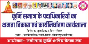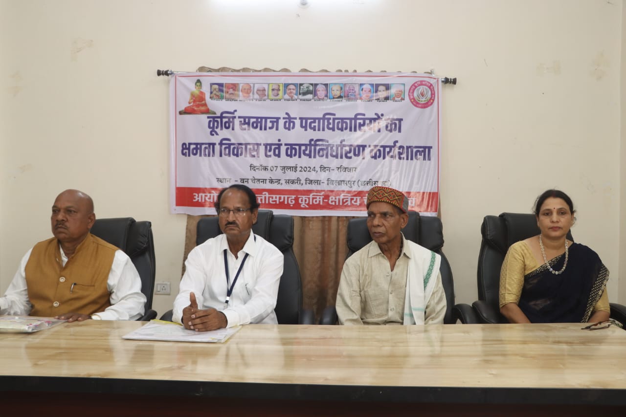 बिलासपुर :- छत्तीसगढ़ कूर्मि क्षत्रिय चेतना मंच द्वारा आयोजित छत्तीसगढ़ में निवासरत समस्त फिरका 30 प्रकार के कूर्मि उपजाति समूह के प्रमुखो एवं संगठन पदाधिकारियों का क्षमता विकास प्रशिक्षण कार्ययोजना निर्धारण- कार्यशाला का आयोजन *वन चेतना केंद्र सकरी* बिलासपुर में सफलता पूर्वक संपन्न हुआ। इसमें रायपुर, बिलासपुर, दुर्ग भिलाई, जांजगीर -चांपा,,सक्ति , मनेंद्रगढ़, कोरिया, कवर्धा पेंड्रा मरवाही, मुंगेली, बेमेतरा , पामगढ़ तखतपुर, ,पाली ,कटघोरा ,कोरबा से 155 समाज प्रमुखों ने हिस्सा लिया। इसमें समाज मे व्याप्त रूढ़िवादी परंपरा, वैज्ञानिक सोंच, शिक्षा , व्यवसाय को बढ़ावा, प्रगतिशील कूर्मि समाज के समग्र विकास हेतु युवाओं तथा महिलाओं की भूमिका को सुनिश्चित करने व आधुनिक समाज में वर्तमान परिदृश्य में हो रहे बदलाव पर लाए गए पूर्व प्रस्ताव के क्रियान्वयन में धीमी गति क्यों ? जैसे विषय पर समीक्षा उपरांत नवीन प्रस्ताव पर चर्चा हुई। प्रथम सत्र के मुख्य अभ्यागत विधायक माननीय व्यास नारायण कश्यप जांजगीर चांपा थे एवं द्वितीय सत्र के मुख्य अभ्यागत माननीय विधायक धरमलाल कौशिक जी रहे ।मंच में विधायक द्वय का शाल श्रीफल बूके से अभिनंदन किया गया । अखिल भारतीय कूर्मि महासभा के संरक्षक श्री मन्नू लाल परगनिया, प्रदेश कूर्मि क्षत्रिय समाज के महामंत्री मोरध्वज चंद्राकर,देशहा कूर्मि समाज अध्यक्ष हीरा सिंह कश्यप, रामशंकर, कश्यप पाटनवार फिरका से सतीश कुमार पाटनवार , बैसवाड़े से रामनारायण कश्यप,परगिया कूर्मि समाज से रामावतार वर्मा,सिगरौर से कौशल सिंह वर्मा, दिल्लीवार कूर्मि समाज से डॉ राजेन्द्र हरमुख , सन्नाड्य कूर्मि से कृष्ण कुमार कौशिक, सिंगरौल से बिरझेराम सिंगरौल ,रामू सिंगरौल,बडगैहा से हरिश्चंद्र वर्मा,बंधईया कूर्मि से अश्विनी कश्यप,भोला कूर्मि छात्रावास ट्रस्ट रायपुर से डॉ मनोज वर्मा, संतोष कौशिक गुरूजी, चंदेल रत्नेश्वर कूर्मि समाज से मनोहर लाल चंदेल,तिरेला कूर्मि समाज से ललित काकडे कन्नौजिया कूर्मि समाज से डॉ हेमंत कश्यप , चंद्नाहू से अरूण कश्यप अलग अलग छ: सत्रों के विषय में श्रोत व्यक्ति के रूप में मंचासीन हुए एवं विचार प्रवाह में हिस्सा लिया।