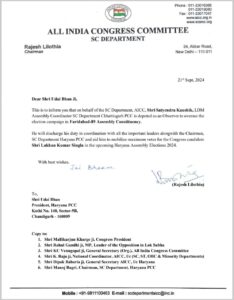 हरियाणा विधानसभा चुनाव के लिए कांग्रेस पार्टी अपनी पूरी ताकत झोंक रही है, पार्टी में विधान सभा चुनाव के लिए कांग्रेस पार्टी सक्रिय नेताओं को कार्यकर्ताओं को चुनाव प्रचार के लिए जिम्मेदारी देकर न्युक्ति कर रही है।