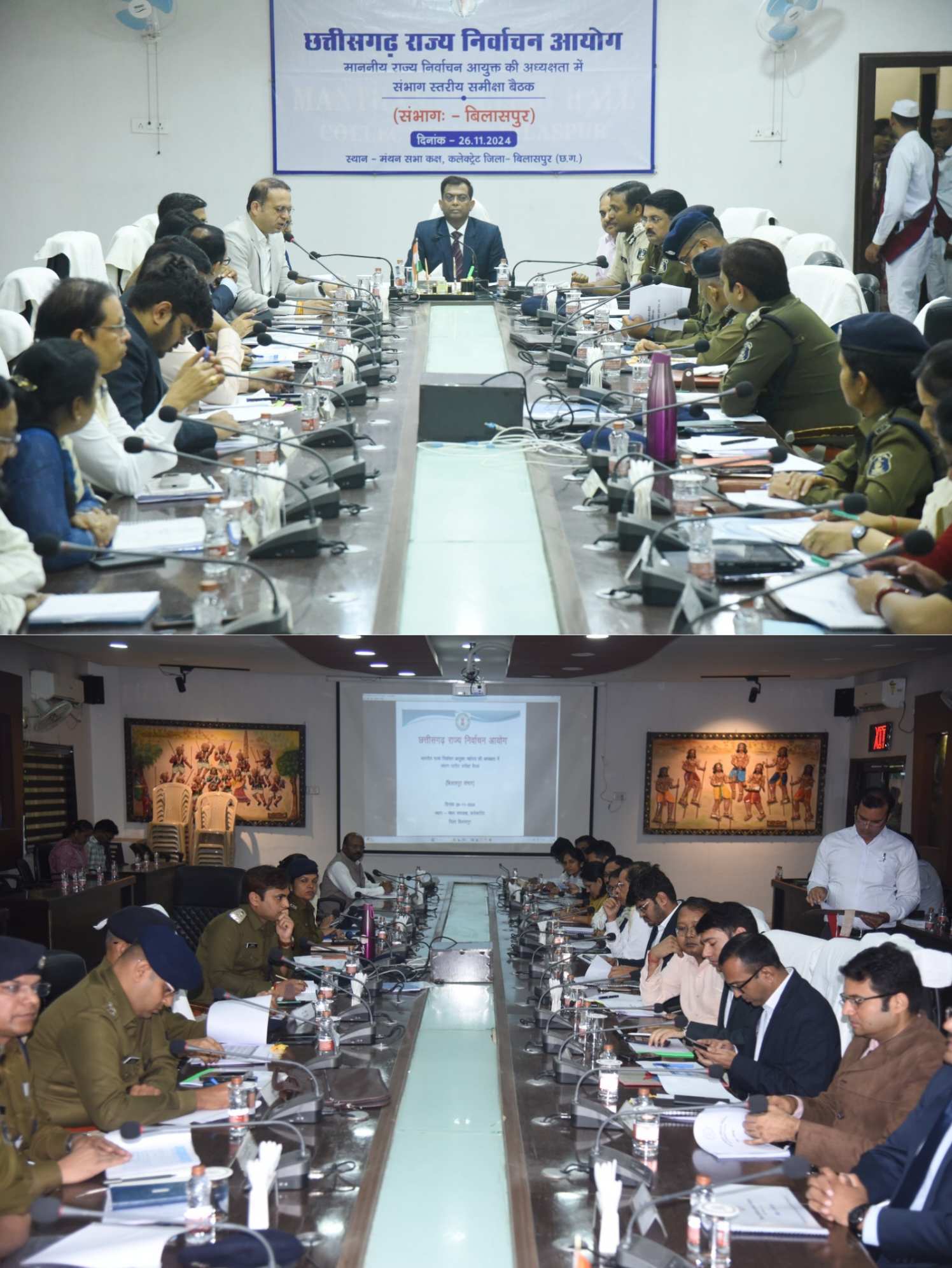बिलासपुर :— राज्य निर्वाचन आयुक्त श्री अजय सिंह की अध्यक्षता मे आज बिलासपुर कलेक्टोरेट के मंथन सभाकक्ष मे स्थानीय निकायों के निर्वाचन की तैयारियों के संबंध में बिलासपुर और सरगुजा संभाग के वरिष्ठ अधिकारियों की समीक्षा बैठक आयोजित की गई। बैठक में दोनों संभाग के संभाग आयुक्त, पुलिस महानिरीक्षक, कलेक्टर, पुलिस अधीक्षक और उप जिला निर्वाचन अधिकारी शामिल हुए। निर्वाचन आयुक्त श्री अजय सिंह ने बैठक में चुनाव संबंधी सभी तैयारियां समय पूर्व सुनिश्चित करने के दिए।