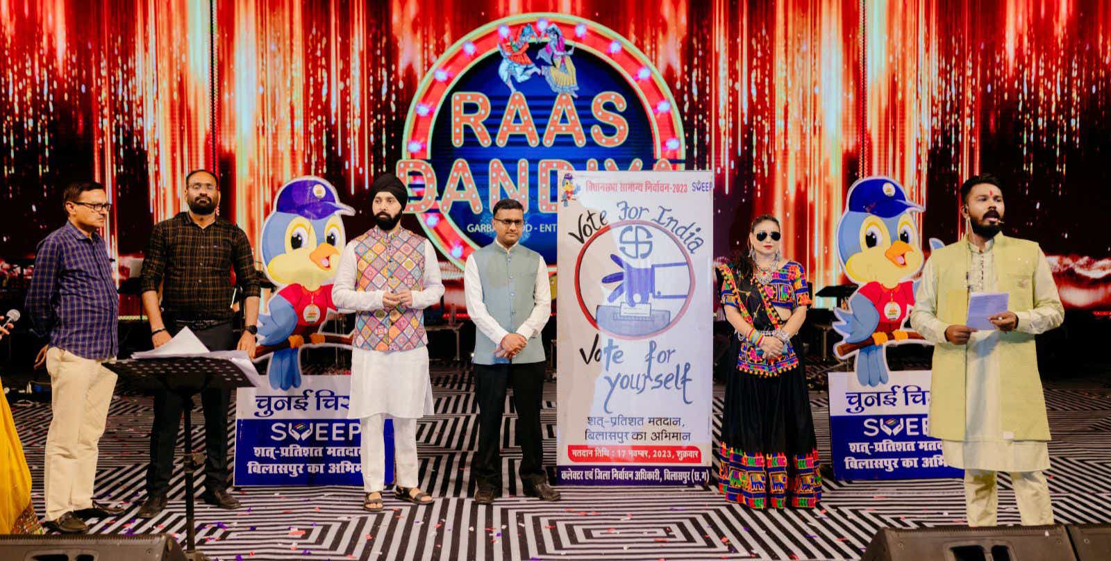 बिलासपुर // शहर में नवरात्रि पर्व के दौरान महराणा प्रताप चौक स्थित फाउंडेशन किक्रेट एकेडमी खेल मैदान में आयोजित रास डांडिया कार्यक्रम में स्वीप गरबा का आयोजन किया गया। कार्यक्रम में लगभग 10 हज़ार से अधिक प्रतिभागियों द्वारा मतदाता जागरूकता गीत पर डांडिया किया गया। जिला पंचायत सीईओ एवं स्वीप के नोडल अधिकारी श्री अजय अग्रवाल ने कार्यक्रम में मौजूद लोगों को आगामी निर्वाचन में बढ़-चढ़कर मतदान के लिए प्रेरित किया। इस दौरान उन्होंने सभी प्रतिभागियों को मतदाता शपथ भी दिलाई। फ़्लैश लाइट जलाकर सभी ने मतदान के लिए प्रतिबद्धता व्यक्त की। कार्यक्रम में भारत निर्वाचन आयोग के द्वारा तैयार किये गये गीत ”मैं भारत हूँ” का भी प्रदर्शन किया गया।