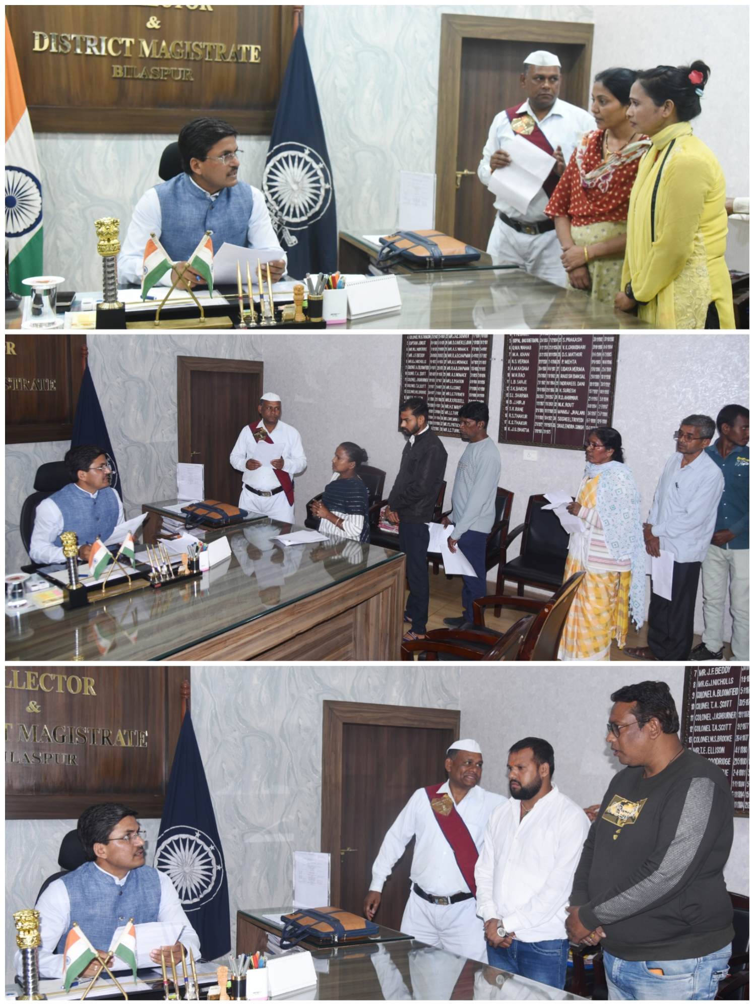 राजकिशोर नगर निवासी श्री मनोज कुमार डिक्सेना द्वारा जमीन के कब्जे की शिकायत कलेक्टर से की। कलेक्टर ने आवेदन एसडीएम तखतपुर केा भेजते हुए आवश्यक कार्रवाई करने के निर्देश दिए। ग्राम मेलनाडीह निवासी श्री प्रताप सिंह नेताम द्वारा एनएच 130 के लिए अधिग्रहण की गई मकान एवं जमीन का मुआवजा दिलाने कलेक्टर को आवेदन दिया। इस मामले को एसडीएम कोटा देखंगे। तखतपुर विकासखंड के ग्राम सागर निवासी नीलम सक्सेना ने विधवा पेंशन दिलाने कलेक्टर को आवेदन सौंपा।
