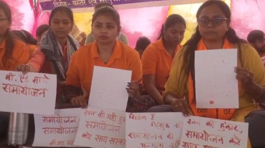 रायपुर : लंबे समय से हड़ताल कर रहे हैं बीएड शिक्षक द्वारा आज अनोखा धरना प्रदर्शन किया गया जहां उन्होंने अपने खून से मुख्यमंत्री विष्णुदेव साय को पत्र लिखा इस पत्र में उन्होंने निवेदन किया है कि जो नौकरी से उन्हें निकाला गया है उसकी जगह उन्हें अन्य नौकरी में विलय किया जाए ताकि वे ओर उनका परिवार बचा रहे।