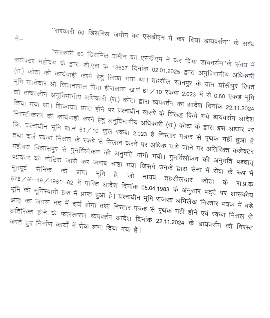 बिलासपुर // कलेक्टर अवनीश शरण के निर्देश पर एसडीएम कोटा ने पुनर्विलोकन सुनवाई के बाद 60 डिसमिल सरकारी जमीन का डायवर्सन रद्द कर दिया है। उन्होंने इस भूमि पर जारी निर्माण कार्य पर भी रोक लगा दी है। कलेक्टर ने 60 डिसमिल सरकारी जमीन के डायवर्सन किए जाने संबंधी खबर को गंभीरता से लिया था और इसे टीएल पंजी में दर्ज कर इसकी जांच और कार्रवाई की नियमित समीक्षा कर रहे थे। गौरतलब है कि तहसील रतनपुर के ग्राम घांसीपुर स्थित भूमि खातेदार श्री किशनलाल पिता हीरालाल ख.नं 61/10 रकबा 2.023 में से 0.60 एकड़ भूमि को तत्कालीन अनुविभागीय अधिकारी (रा.) कोटा द्वारा व्यपवर्तन का आदेश दिनांक 22 नवंबर 2024 किया गया था। शिकायत प्राप्त होने पर प्रश्नाधीन खसरे के विरूद्ध किये गये डायवर्सन आदेश निरस्तीकरण की कार्यवाही करने हेतु अनुविभागीय अधिकारी (रा.) कोटा के द्वारा इस आधार पर कि, प्रश्नाधीन भूमि ख.नं 61/10 कुल रकबा 2.023 हे निस्तार पत्रक से पृथक नहीं हुआ है तथा दर्ज रकबा मिसल के रकबे से मिलान करने पर अधिक पाये जाने पर अतिरिक्त कलेक्टर बिलासपुर से पुनर्विलोकन की अनुमति मांगी गयी। पुनर्विलोकन की अनुमति पश्चात् पक्षकार को नोटिस जारी कर जवाब चाहा गया। जिसमें उनके द्वारा सेना में सेवा के रूप में भूतपूर्व सैनिक को प्राप्त भूमि है, जो नायब तहसीलदार कोटा के रा.प्र.क्रमांक 578/3-19/1981-82 में पारित आदेश दिनांक 05.04.1983 के अनुसार पट्टे पर शासकीय भूमिको भूमिस्वामी हक में प्राप्त हुआ है। प्रश्नाधीन भूमि राजस्व अभिलेख निस्तार पत्रक में बड़े झाड़ का जंगल मद में दर्ज होना तथा निस्तार पत्रक से पृथक नहीं होने एवं रकबा मिसल से अतिरिक्त होने के फलस्वरूप व्यपवर्तन आदेश दिनांक 22 नवंबर 2024 के डायवर्सन को निरस्त करते हुए निर्माण कार्यों पर रोक लगा दिया गया है।