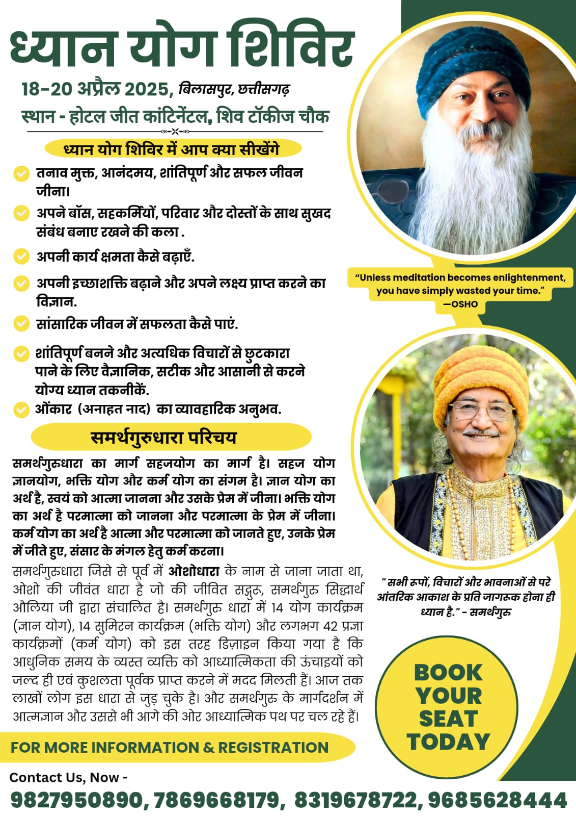 बिलासपुर :— समर्थगुरुधारा मैत्री संघ छत्तीसगढ़ के तत्वाधान में बिलासपुर,कोटा,लोरमी,मुंगेली,चाँपा संघ के ओशो सन्यासियों के प्रयासों से 18 अप्रैल से 20 अप्रेल तक ध्यान योग शिविर का आयोजन, होटल जीत कांटीनेंटल (शिव टाकीज चौक) में रखा गया है, इस ध्यान योग शिविर में अधिक से अधिक संख्या में सम्मलित होकर आनंदित जीवन जीने की कला को सीखे।