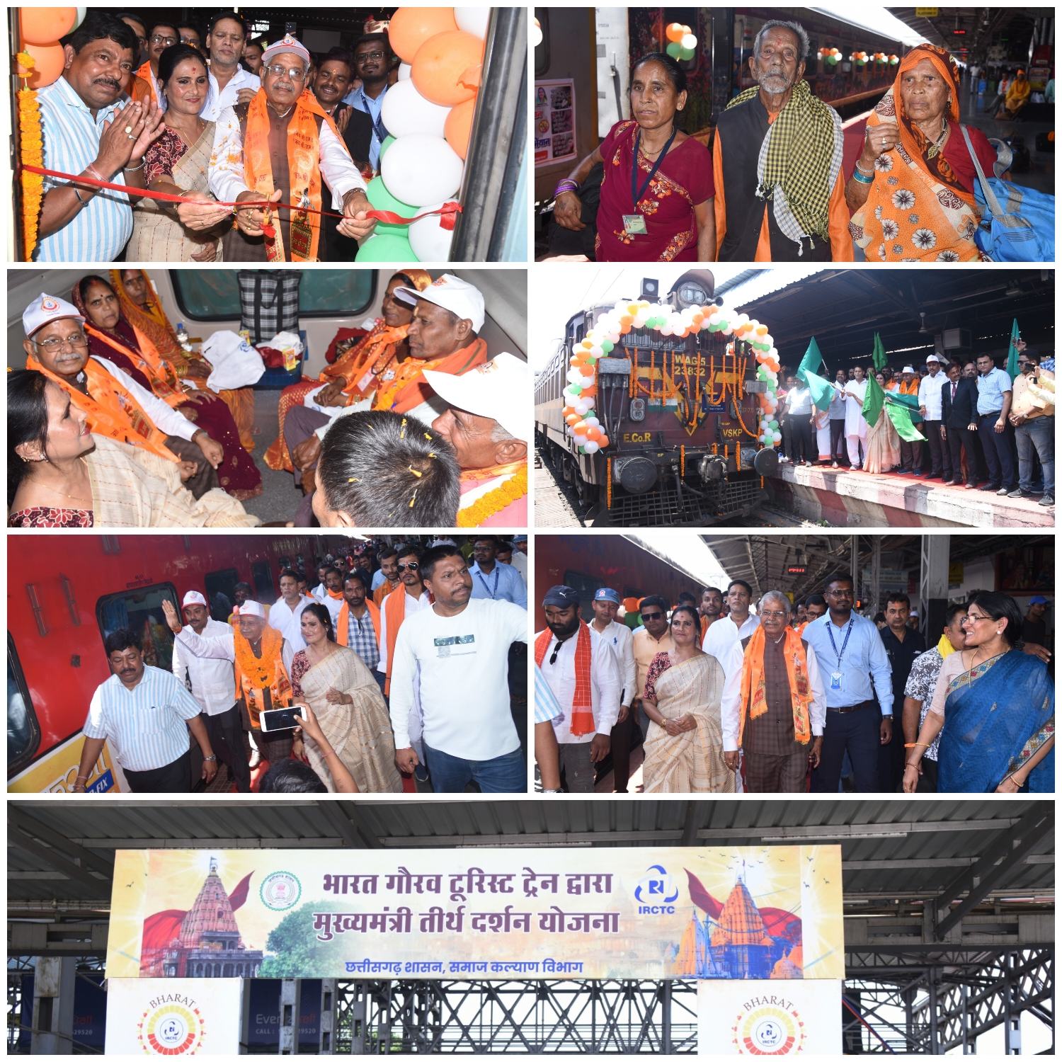 बिलासपुर // मुख्यमंत्री विष्णुदेव साय की विशेष पहल पर पांच साल के लम्बे अंतराल के बाद मुख्यमंत्री तीर्थ दर्शन योजना शुरू हुई है। योजना के तहत आज बिलासपुर जिले के 775 यात्रियों का पहला जत्था पुरी, भुवनेश्वर, कोणार्क दर्शन के लिए रवाना हुआ। यात्रियों ने योजना के लिए प्रधानमंत्री श्री नरेन्द्र मोदी और मुख्यमंत्री श्री विष्णुदेव साय के प्रति आभार व्यक्त किया। बिलासपुर, मुंगेली और जीपीएम जिले के तीर्थ यात्री बिलासपुर स्टेशन पर पहुंचे जहां पर जनप्रतिनिधि और प्रशासनिक अधिकारियों ने तीर्थयात्रियों का तिलक लगाकर और माला पहनाकर स्वागत किया। ट्रेन को बिल्हा विधायक श्री धरमलाल कौशिक, बेलतरा विधायक श्री सुशांत शुक्ला ने हरी झण्डी दिखाकर रवाना किया। यात्रियों को भारत गौरव टूरिस्ट ट्रेन द्वारा रवाना किया गया। तीर्थ यात्रा की बरसो पुरानी अभिलाषा पूरी होने पर बुजुर्गो के आंखों की चमक देखते बन रही थी। इस अवसर पर महापौर श्रीमती पूजा विधानी, जिला पंचायत अध्यक्ष श्री राजेश सूर्यवंशी सहित अन्य जनप्रतिनिधि एवं नगर निगम कमिश्नर श्री अमित कुमार मौजूद थे।
