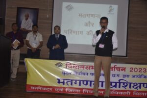 कलेक्टर एवं जिला निर्वाचन अधिकारी श्री अवनीश शरण ने भी प्रशिक्षण सत्र को सम्बोधित किया। उन्होंने भी निष्पक्ष एवं पारदर्शिता पूर्ण मतगणना के लिए उपयोगी टिप्स दिए। बिलासपुर सहित मुंगेली एवं जीपीएम जिले की 9 विधानसभा क्षेत्रों के रिटर्निंग अफसर एवं उनके सहयोगी अधिकारी कर्मचारी इस अवसर पर उपस्थित थे। राज्य निर्वाचन कार्यालय से पहुंचे मास्टर ट्रेनर्स द्वारा मतगणना के पूर्व की तैयारी, मानव संसाधन एवं अन्य जरूरी संसाधनों की व्यवस्था, डाक मतपत्र की गणना, इव्हीएम से मतगणना की व्यवस्था, मतगणना साफ्टवेयर, इण्डेक्स कार्ड भरने की व्यवस्था सहित अन्य महत्वपूर्ण विषयों पर जानकारी दी गई। मतगणना दिवस के दिन स्ट्रांग रूम और मतगणना कक्ष में अपेक्षित नियमों के पालन के बारे में बताया गया। डाक मतपत्र एवं कण्ट्रोल यूनिट के मतों की गणना की संपूर्ण प्रक्रिया को सरलता से समझाया गया। रिटर्निंग अफसरों की जिज्ञासाओं का समाधान भी किया गया। नगर निगम आयुक्त श्री कुणाल दुदावत, जिला पंचायत सीईओ श्री अजय अग्रवाल, अपर कलेक्टर एवं उप जिला निर्वाचन अधिकारी श्री शिवकुमार बनजी, राज्य स्तरीय मास्टर ट्रेनर श्री एमटी आलम सहित बिलासपुर, मुंगेली एवं जीपीएम जिले के रिटर्निंग अफसर, सहायक रिटर्निंग अफसर एवं सहयोगी अधिकारी इस अवसर पर उपस्थित थे।