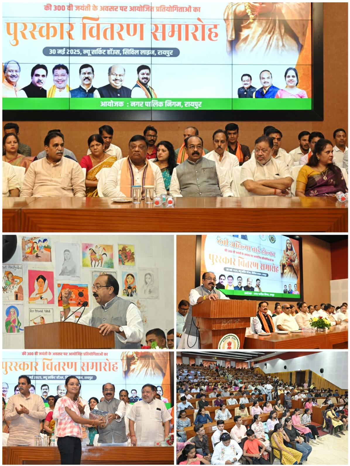 महापौर श्रीमती चौबे ने बताया कि रानी अहिल्याबाई होल्कर के जीवन के विविध पक्षों को बच्चों और युवाओं के सामने लाने रायपुर नगर निगम द्वारा अलग-अलग वर्गों में निबंध और चित्रकला प्रतियोगिता आयोजित की गई थी। चित्रकला स्पर्धा में सीनियर वर्ग में 27 और जूनियर वर्ग में 83 बच्चों ने भाग लिया। वहीं निबंध लेखन में सीनियर वर्ग में 40 और जूनियर वर्ग में 58 प्रतिभागी शामिल हुए। दोनों स्पर्धाओं में विभिन्न स्कूलों और कॉलेजों के कुल 208 विद्यार्थियों ने भागीदारी की। रायपुर नगर निगम के सभापति श्री सूर्यकांत राठौर, आयुक्त विश्वदीप, संस्कृति विभाग के अध्यक्ष श्री अमर गिदवानी, एमआईसी सदस्य, जोन अध्यक्ष और पार्षदों सहित दोनों स्पर्धाओं के प्रतिभागी विद्यार्थी तथा उनके अभिभावक बड़ी संख्या में कार्यक्रम में मौजूद थे।