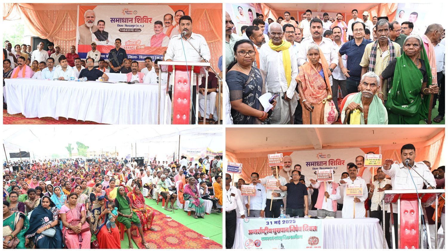 कार्यक्रम को संबोधित करते हुए विधायक सुशांत शुक्ला ने कहा कि प्रदेश सरकार की सोच है कि आम जनता की समस्याओं का निदान उनके गांव घरों में जाकर किया जाए। उन्होंने रानी अहिल्या बाई होल्कर की जयंती पर उन्हें नमन करते हुए कहा कि उनका जीवन नारी सशक्तिकरण और सुशासन की मिसाल है। श्री शुक्ला ने कहा कि शासन की योजनाओं में शासन का हिस्सा बनकर आप भी सहयोग दे। उन्होंने लोगों से अपील की कि शिविर में अधिक से अधिक संख्या में आकर शासकीय योजनाओं का लाभ लें। जल संरक्षण और जल संचय हम सबकी जिम्मेदारी है। उन्होंने विश्व तंबाखू निषेध दिवस पर सभी को तंबाखू सहित अन्य नशे के विरुद्ध शपथ दिलाई। कलेक्टर श्री संजय अग्रवाल ने कहा कि लोग शिविर में शासन की विभिन्न योजनाओं की जानकारी ले सकते हैं। उन्होंने ग्रामीणों से जल संरक्षण की अपील की। उन्होंने बताया कि यहां 8 ग्राम पंचायत के ग्रामीणों से लगभग 4500 आवेदन मिले जिनका निराकरण कर लिया गया है। अधिकतर आवेदन आवास, शौचालय और उज्जवला योजना से संबंधित है।,