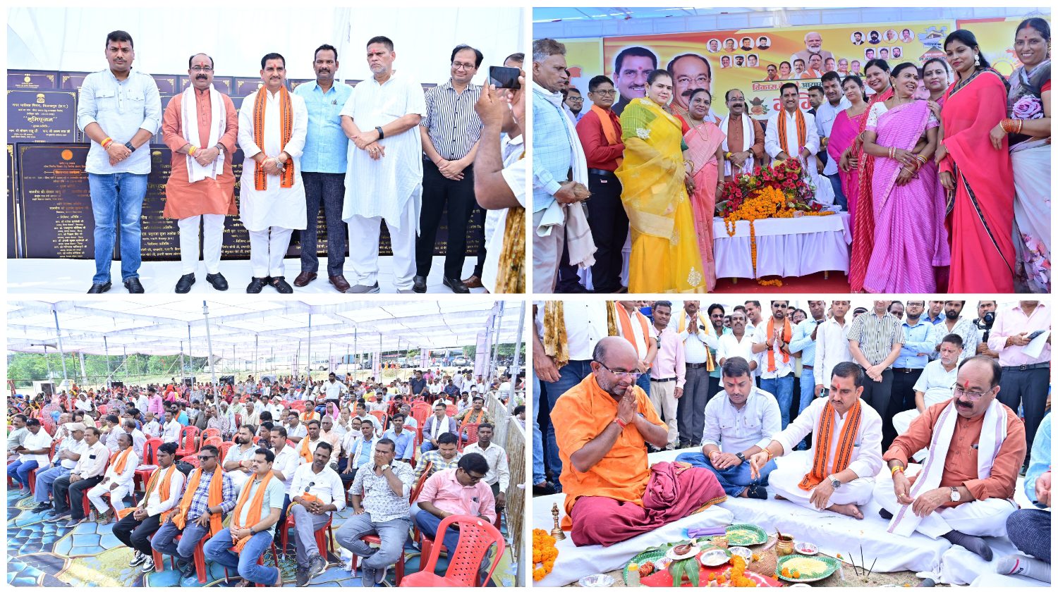 भूमिपूजन में पधारे प्रमुख अभ्यागतों का अतिथियों का विधायक सुशांत शुक्ला नभगवान राम की मूर्ति और साल भेंट कर सम्मान किया