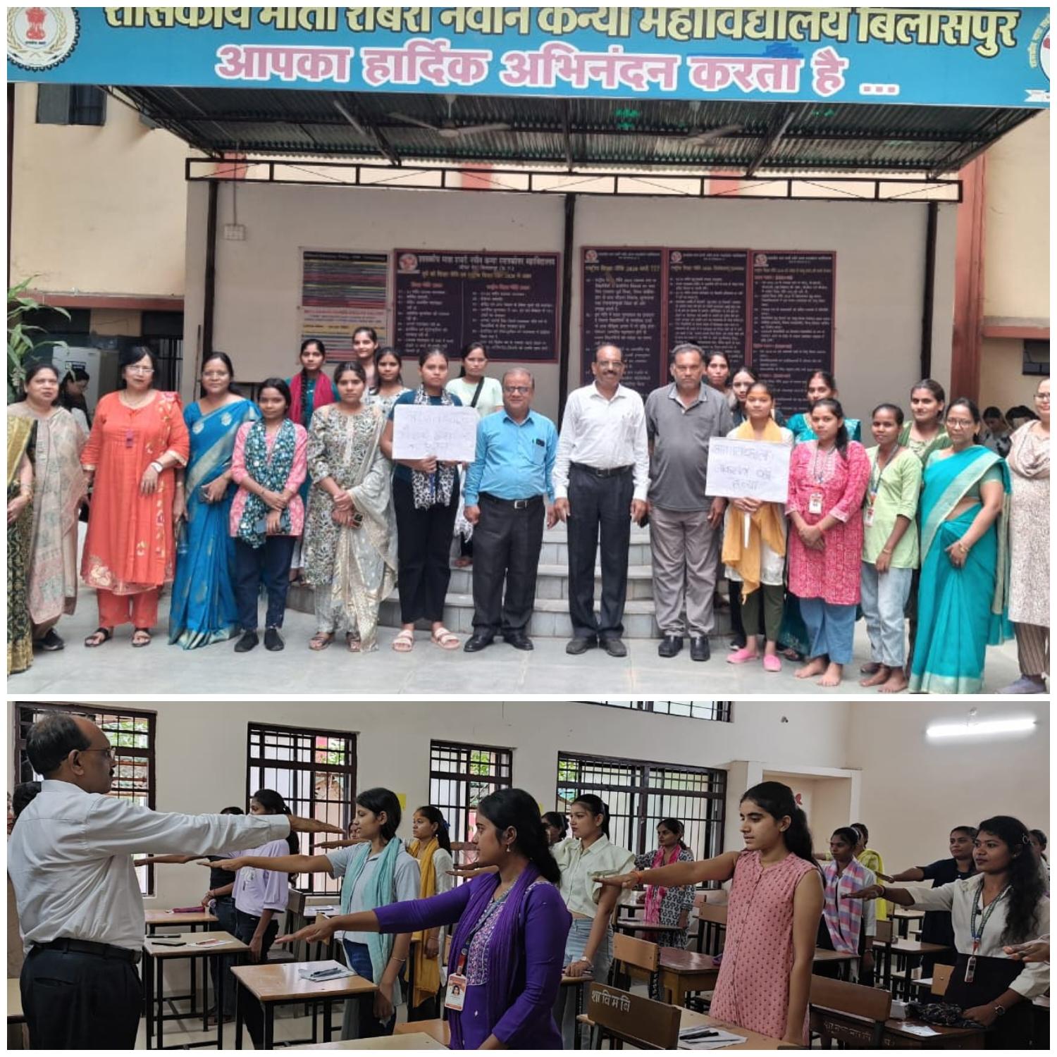 बिलासपुर // अंतर्राष्ट्रीय नशा निवारण दिवस के अवसर पर शासकीय माता शबरी नवीन कन्या स्नातकोत्तर महाविद्यालय में चित्रकला, भाषण एवं स्लोगन प्रतियोगिता का आयोजन किया गया। इस अवसर पर महाविद्यालय के प्राचार्य डॉ. के. के. भण्डारी द्वारा नशा मुक्ति हेतु शपथ दिलाई गई तथा मादक पदार्थाें के सेवन के रोकथाम हेतु प्राचार्य द्वारा छात्राओं को संबोधित किया गया। उन्होंने कहा कि छात्राएं स्वयं नशे से दूर रहें एवं अपने परिवार एवं आस पड़ोस में भी जागरूकता फैलाएं। उन्होनें यह भी कहा कि मोबाईल का अधिक और अनावश्यक प्रयोग भी एक नशा है, इससे बचना भी आवश्यक है। इस अवसर पर महाविद्यालय के समस्त प्राध्यापक, सहायक प्राध्यापक एवं कर्मचारीगण उपस्थित थे। छात्राओं ने भी बड़ी संख्या में प्रतियोगिता में भाग लिया। प्राचार्य डॉ. के. के. भण्डारी के निर्देशन में यह कार्यक्रम सम्पन्न हुआ। कार्यक्रम का संचालन डॉ. यतिनंदिनी पटेल तथा आभार प्रदर्शन डॉ. बेला महंत द्वारा किया गया।
