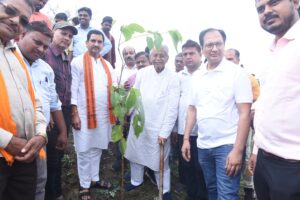 बिलासपुर :— केंद्रीय आवासन एवं शहरी विकास राज्यमंत्री तोखन साहू ने एक पेड़ मां के नाम अभियान के तहत बिल्हा ब्लॉक के परसदा(भटगांव) में पौधा लगाया। आज यहां आयोजित कार्यक्रम में बिल्हा विधायक श्री धरमलाल कौशिक, जनपद अध्यक्ष श्री राम कुमार कौशिक, कलेक्टर श्री संजय अग्रवाल सहित अन्य जनप्रतिनिधियों ने छायादार और फलदार पौधे लगाएं। जिले में आज वन, उद्यान, पंचायत एवं ग्रामीण विकास विभाग, नगरीय प्रशासन के सहयोग से सभी ब्लॉक मुख्यालय, स्कूलों, सड़क किनारे,आंगनबाड़ी केन्द्रों में सघन पौधरोपण अभियान चलाकर जिले में 3 लाख 72 हजार से ज्यादा पौधे लगाए गए। साथ ही साथ गोठानो में सीएलएफ के माध्यम से फलदार एवं छायादार पौधे लगाए गए। इसके अलावा उद्योगों में भी सघन पौधरोपण किया गया। रिमझिम फुहारों के बीच सभी ने पौधे लगाकर पर्यावरण सुरक्षा का संदेश दिया । कार्यक्रम में शहीद विशुनदास कुर्रे के परिवारजनों और बिल्हा ब्लॉक में 500 पेड़ लगाने वाले श्री हवेंद्र निर्णयजेक को सम्मानित किया गया।