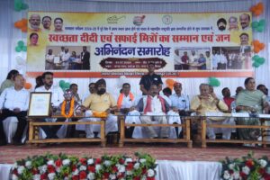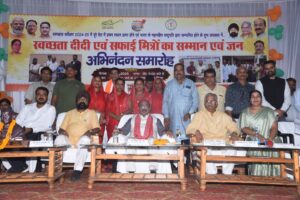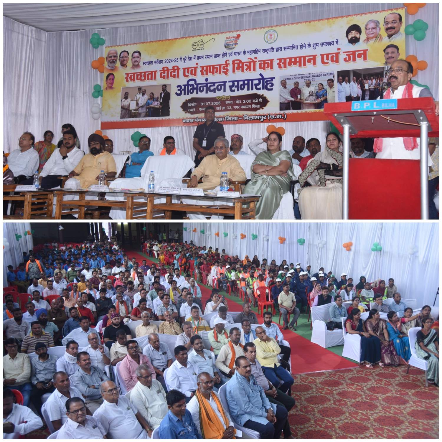 बिलासपुर :— उप मुख्यमंत्री एवं जिले के प्रभारी मंत्री श्री अरूण साव ने आज बिल्हा नगर पंचायत के कन्या भवन में स्वच्छता दीदियों और सफाई मित्रों का सम्मान किया। स्वच्छता के क्षेत्र में ऐतिहासिक उपलब्धि हासिल करते हुए बिल्हा नगर पंचायत ने स्वच्छता सर्वेक्षण 2024-25 में 20 हजार से कम आबादी वाले शहरों की श्रेणी में देशभर में प्रथम स्थान प्राप्त किया है। उन्होंने स्वच्छता दीदियों से कहा कि छत्तीसगढ़ को बहुत बड़ी प्रतिष्ठा आपके कारण ही मिली है। स्वच्छता ने आज जन आंदोलन का रूप ले लिया है। देश में पहला स्थान हासिल करना हमारे लिए गौरव का विषय है। अब हमे इसे बरकरार रखना होगा। बिल्हा के एक-एक व्यक्ति को स्वच्छता के लिए संकल्प लेना होगा। उप मुख्यमंत्री ने कहा कि बिल्हा के विकास के लिए पैसों की कोई कमी नहीं होगी। उन्होंने सभी को स्वच्छता की शपथ भी दिलाई। कार्यक्रम में बिल्हा विधायक श्री धरमलाल कौशिक, क्रेडा अध्यक्ष श्री भूपेन्द्र सवन्नी, नगर पंचायत अध्यक्ष वंदना जेण्ड्रे, उपाध्यक्ष श्री सतीश शर्मा, जनपद अध्यक्ष राम कुमार कौशिक, एसडीएम श्री बजरंग वर्मा, सीएमओ श्री प्रवीण गहलोत, स्वच्छता दीदी, सफाई मित्र, कमांडो और बड़ी संख्या में नगरवासी मौजूद थे।