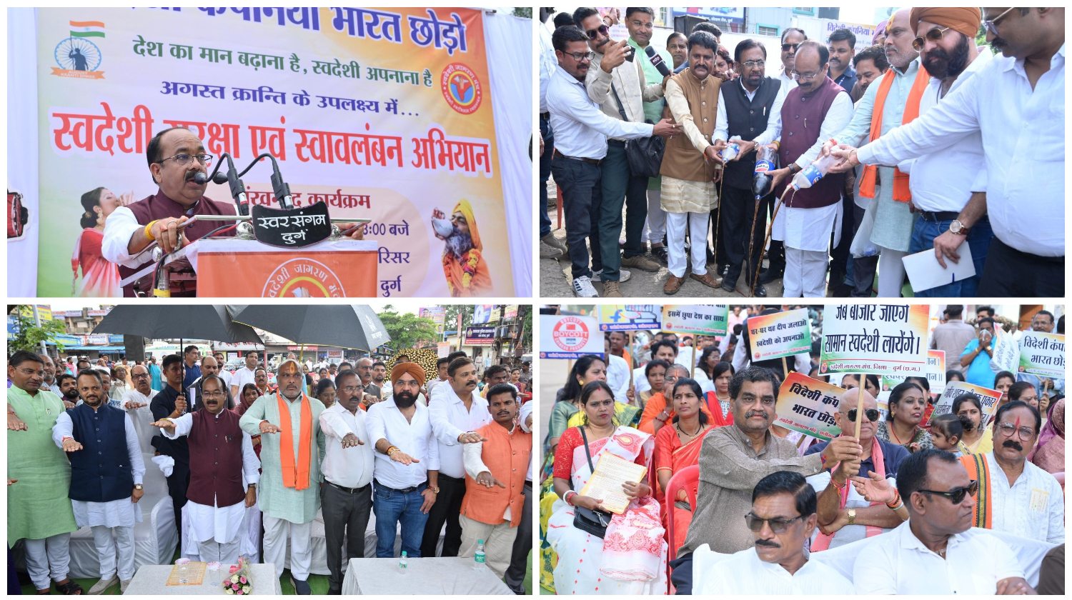 बिलासपुर :— उप मुख्यमंत्री अरुण साव दुर्ग में स्वदेशी सुरक्षा एवं स्वावलंबन अभियान कार्यक्रम में शामिल हुए। उन्होंने इस दौरान पंडित दीनदयाल उपाध्याय की प्रतिमा पर माल्यार्पण कर श्रद्धांजलि अर्पित की। श्री साव ने कार्यक्रम में कोका-कोला, पेप्सी जैसी विदेशी पेय सामग्रियों को प्रतीकात्मक रूप से नाली में बहाकर विदेशी वस्तुओं के बहिष्कार का आह्वान किया।