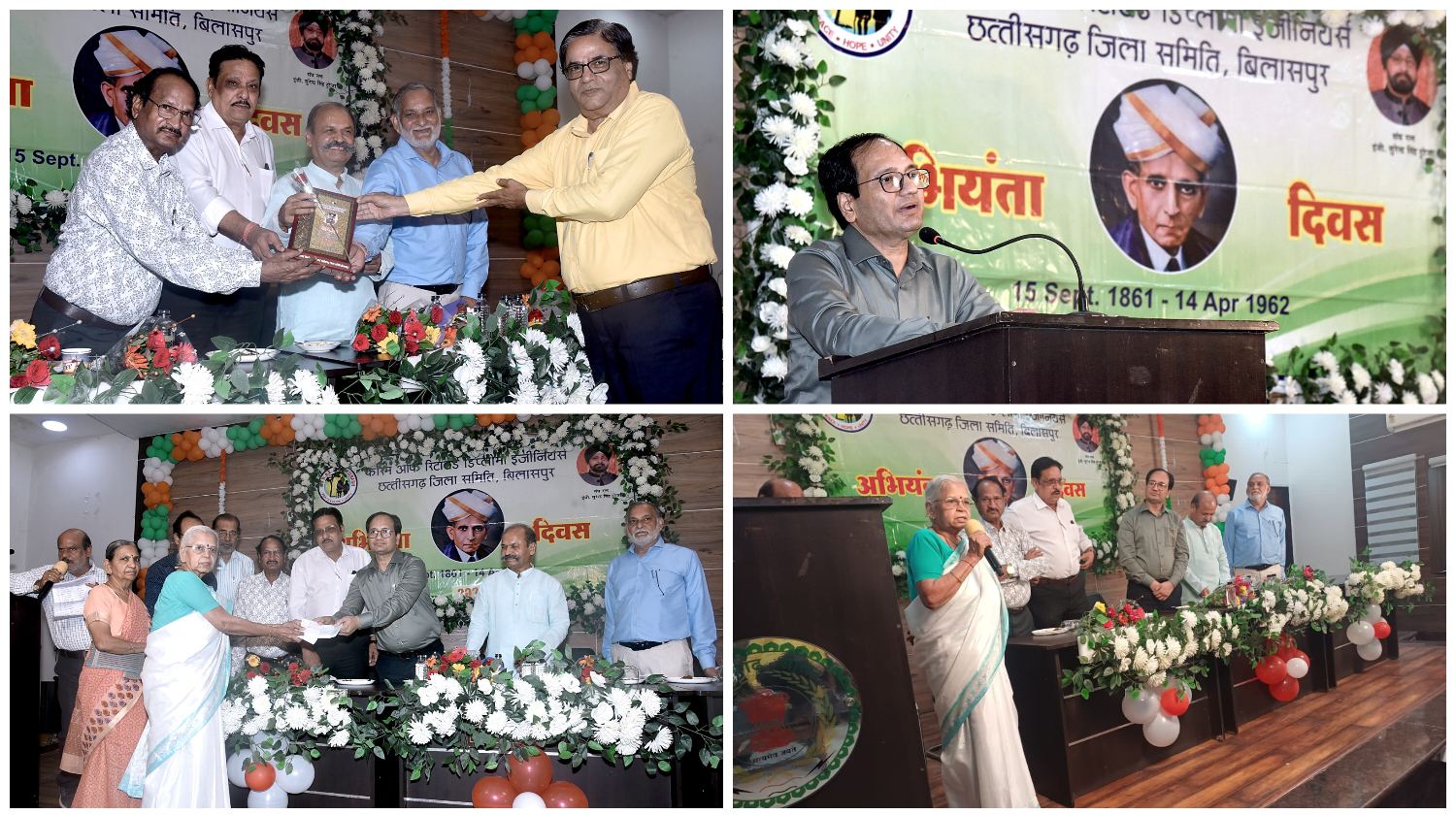 बिलासपुर, 15 सितंबर 2025 :— अभियंता दिवस के अवसर पर प्रार्थना भवन, सिंचाई परिसर बिलासपुर में गरिमामय कार्यक्रम का आयोजन किया गया। कार्यक्रम में कलेक्टर श्री संजय अग्रवाल (आईएएस) मुख्य अतिथि, PMGSY के सेवानिवृत्त अधीक्षण अभियंता श्री संजय शर्मा अध्यक्ष तथा वरिष्ठ अभियंता इं. सिद्धेश्वर पाटनवार (पूर्व संरक्षक रिटायर्ड डिप्लोमा इंजीनियर संघ प्रांतीय समिति ) इं. एल.के. गहवई (संरक्षक रिटायर्ड डिप्लोमा इंजीनियर संघ प्रांतीय समिति ) एवं इं. महेन्द्र जैन (प्रदेश अध्यक्ष, वंदे मातरम मित्र मंडल ) विशिष्ट अतिथि के रूप में उपस्थित रहे।