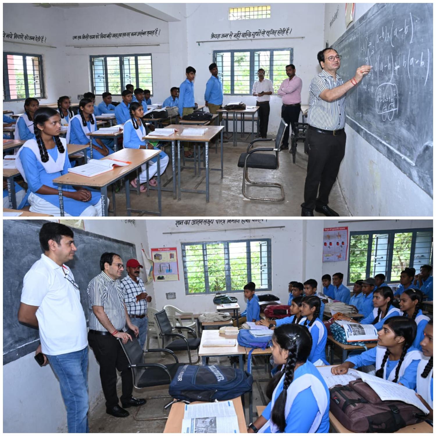 बिलासपुर // स्वच्छता एवं सेवा अभियान के तहत तखतपुर विकासखण्ड के दौरे पर पहुंचे कलेक्टर संजय अग्रवाल ने आज हाई स्कूल हरदी का अचानक दौरा किया। जिला पंचायत के सीईओ संदीप अग्रवाल भी दौरे में साथ थे। बिना अवकाश स्वीकृति के प्रभारी प्राचार्य रमेश साहू एवं शिक्षक निर्मल शर्मा नदारद पाये गये। उनके विरूद्ध अनुशासनात्मक कार्रवाई के लिए जिला शिक्षा अधिकारी को शो-कॉज नोटिस जारी करने के निर्देश दिए। स्कूल के अंदर और बाहर गंदगी का आलम देख कलेक्टर बेहद नाराज हुए। उन्होंने विशेष स्वच्छता अभियान चलाकर संपूर्ण परिसर को साफ-सफाई करने की सख्त लहजे में हिदायत दी। कलेक्टर ने बच्चों की कक्षा में पहुंचकर शिक्षा गुणवत्ता का भी परीक्षण किया। कक्षा नवमीं में सामान्य अंग्रेजी और दसवीं में गणित की पढ़ाई हो रही थी। पूछताछ में सामान्य से सवालों के जवाब बच्चे नहीं दे पाए। अंग्रेजी की लाईनें ठीक से पढ़ने एवं हिज्जे में उन्हें दिक्कतें हो रही थीं। कक्षा दसवीं में बच्चों को कलेक्टर ने पाईथागोरम नियम की सरल व्याख्या कर समझाए। कलेक्टर ने बच्चों से उनके भावी केरियर की जानकारी ली। कलेक्टर ने कहा कि अपने जीवन का लक्ष्य बनाकर उसे प्राप्त करने में लग जाइए। सफलता जरूर हाथ लगेगी। देश एवं समाज में जितने भी बड़े लोग हुए हैं, सबने जीवन की शुरूआत में ही सपने देखे और उसे प्राप्त करने के लिए जी-तोड़ मेहनत किया। स्कूल के अलावा घर में भी पाठ को दुहराने की सलाह कलेक्टर ने दी। कलेक्टर ने पढ़ाई के साथ शारीरिक स्वास्थ्य एवं खेल कूद के साथ भी जीवन में संतुलन बनाने की जरूरत बताई।