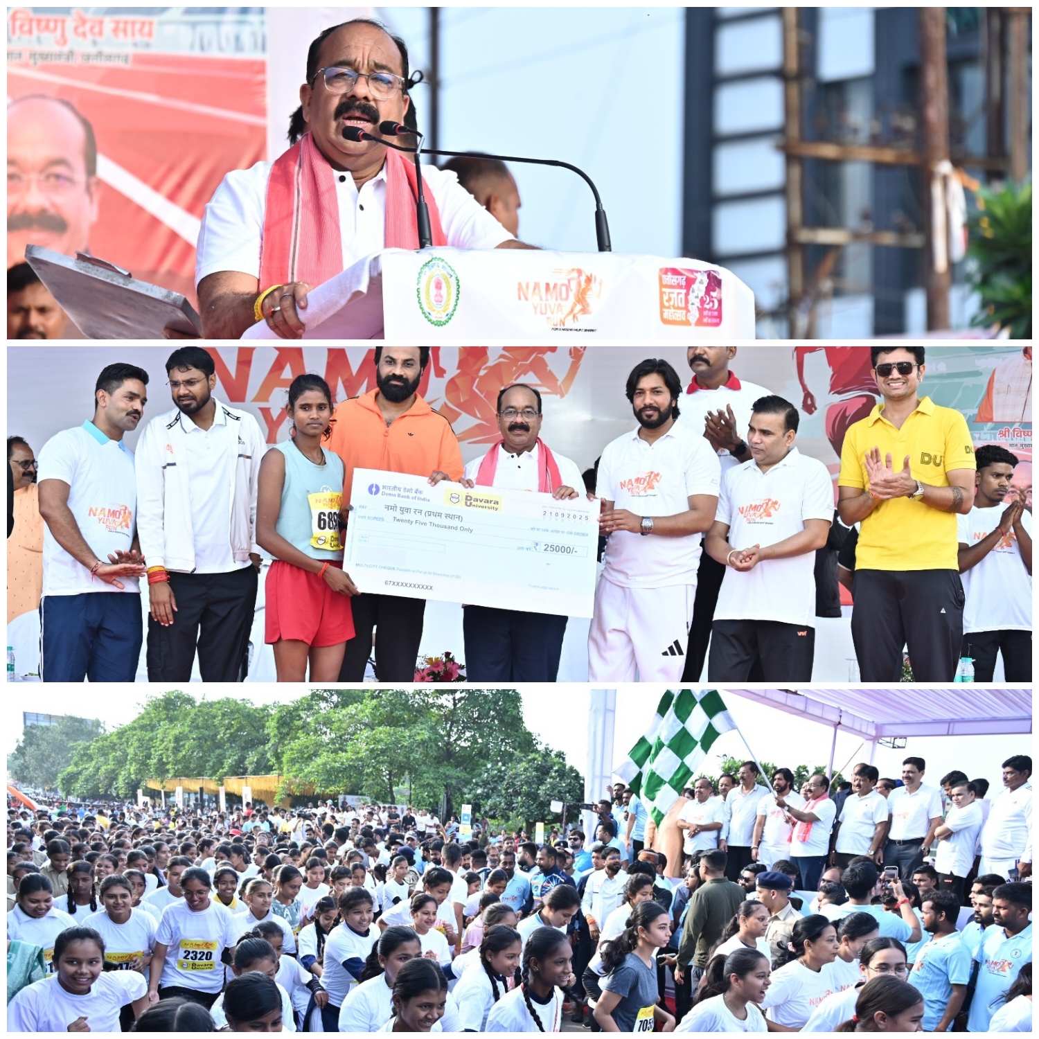 उप मुख्यमंत्री श्री अरुण साव ने ‘नमो युवा रन’ का शुभारंभ करते हुए कहा कि देश का हर युवा स्वस्थ हो, समर्थ हो, सक्षम हो और नशे से दूर रहे, इसकी जागरूकता के लिए इस दौड़ का आयोजन किया गया है। प्रधानमंत्री श्री नरेन्द्र मोदी ने देश के युवाओं और खेलों की तरक्की के लिए महत्वपूर्ण काम किए हैं। विभिन्न योजनाओं और कार्यक्रमों के माध्यम से भारत सरकार युवा शक्ति को तैयार करने का काम कर रही है।