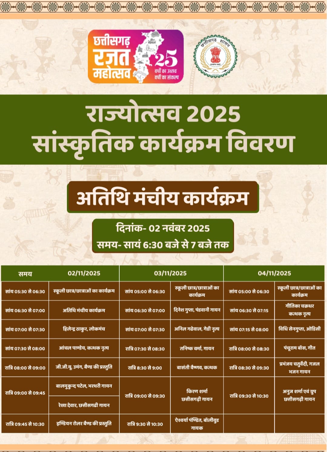 कार्यक्रम के पहले दिन 2 नवम्बर को शाम 5 बजे से साढ़े 6 बजे तक स्कूली छात्र-छात्राओं का कार्यक्रम होगा। इसके बाद 6.30 बजे से 7.30 बजे तक लोक मंच हिलेन्द्र ठाकुर की प्रस्तुति, रात 7.30 बजे से 8 बजे तक आंचल पाण्डेय का कत्थक नृत्य, 8 से 9 बजे तक जीजीयू का उमंग बैण्ड की प्रस्तुति, 9 बजे से 9.45 बजे तक बालमुकुंद पटेल का भरथरी गायन एवं रेखा देवार का छत्तीसगढ़ी गायन तथा रात्रि 9.45 बजे से 11 बजे तक इण्डियन रोलर बैण्ड की प्रस्तुति के साथ ही पहले दिन का कार्यक्रम संपन्न होगा। दूसरे दिन 3 नवम्बर को शाम 5 से 6.30 बजे तक स्कूली बच्चों का कार्यक्रम, 6.30 बजे से 7 बजे तक दिनेश गुप्ता का पण्डवानी गायन, शाम 7 से 7.30 बजे तक अनिल गढ़ेवाल का गेड़ी नृत्य, रात 7.30 से 8.30 बजे तक तनिष्क वर्मा का गायन, साढ़े 8 बजे से साढ़े 9 बजे तक बासन्ती वैष्णव का कत्थक नृत्य और रात्रि 9.30 बजे से 11 बजे तक ऐश्वर्या पण्डित बॉलीबुड का गायन होगा। तीसरे और अंतिम दिन 4 नवम्बर को स्कूली बच्चों के कार्यक्रम के बाद साढ़े 6 से 7.15 बजे तक गीतिका चक्रधर का कत्थक नृत्य, शाम सवा 7 से 8 बजे तक विधि सेनगुप्ता का ओडिसी नृत्य, रात्रि 8 से साढ़े 8 बजे तक पंचूराम का बांस गीत, रात्रि साढ़े 8 से 9.30 बजे तक प्रभंजय चतुर्वेदी का गजल एवं भजन गायन तथा रात्रि साढ़े 9 बजे से अनुज शर्मा गु्रप का छत्तीसगढ़ी कार्यक्रमों की प्रस्तुति दी जायेगी।