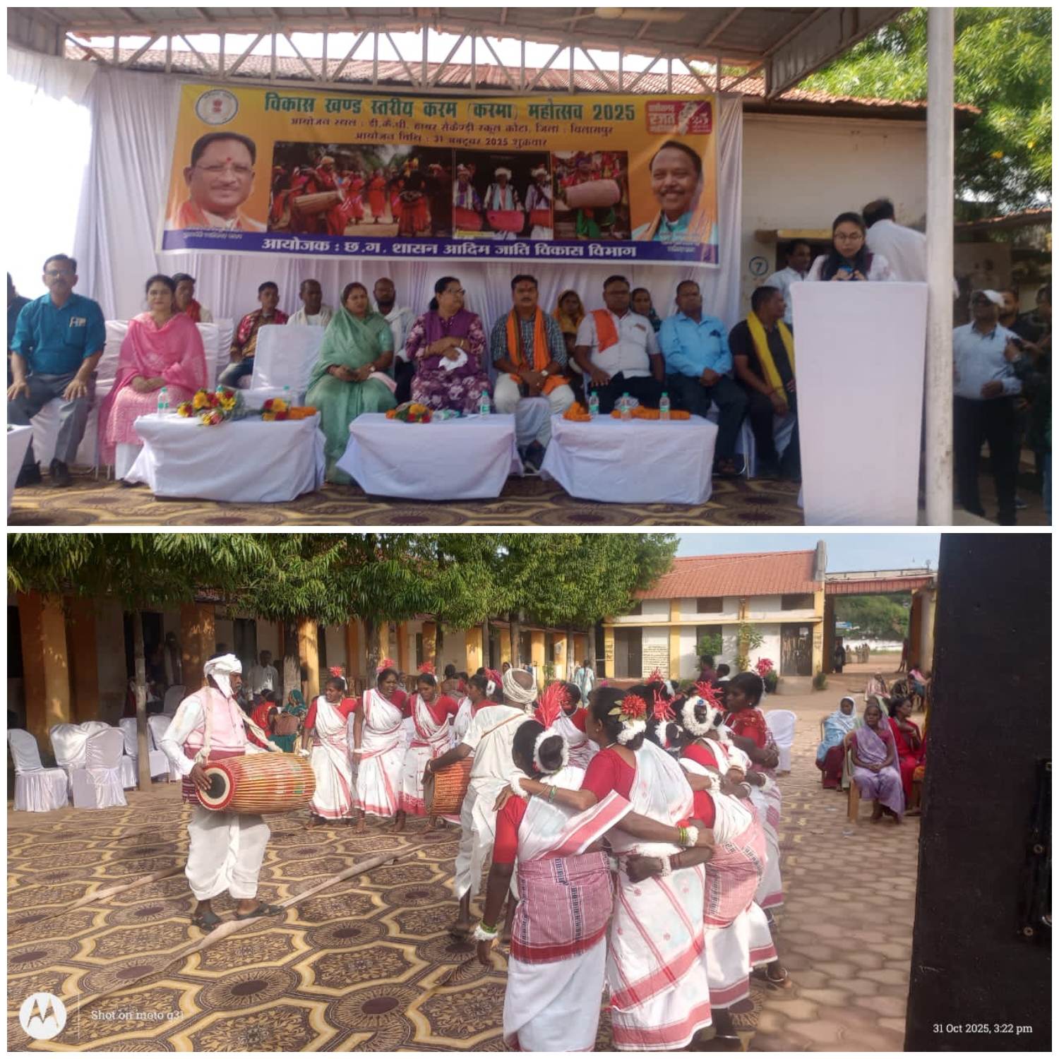 प्रतियोगिता में सम्मिलित निर्णायक मंडल द्वारा जीवन ज्योति करमा दल परसापानी को प्रथम स्थान एवं द्वितीय स्थान बैगिन-बैगा करमा दल कुरदर को दिया गया। कार्यक्रम की अध्यक्षता जनपद पंचायत अध्यक्ष कोटा श्रीमती सूरज साधेलाल भारद्वाज, जनपद पंचायत कोटा उपाध्यक्ष श्रीमती सरोज दुर्गेश साहू, श्री मनोहर सिंह राज द्वारा की गई। उक्त कार्यक्रम में विभाग की ओर से सुश्री आकांक्षा पटेल सहायक संचालक, डॉ. जी. एस. अश्विनी कुमार प्राचार्य प्रयास आवासीय विद्यालय बिलासपुर, श्री पवन कुमार शर्मा, कनिष्ठ लेखा अधिकारी, श्री सुशील कुमार मिश्रा, सेवानिवृत्त क्रीडा अधिकारी, नोडल अधीक्षक श्री मो. इकबाल, छात्रावास अधीक्षक एवं समस्त अधीक्षकगण सहित अधिकारी-कर्मचारी उपस्थित रहे। इस कार्यक्रम का उद्देश्य जनजातीय संस्कृति उनके पारंपरिक रीति-रिवाज और कला संस्कृति को बढ़ावा देना और संरक्षित करना है।