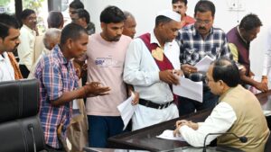बिलासपुर // कलेक्टर संजय अग्रवाल ने साप्ताहिक जनदर्शन में दूर-दराज से पहुंचे ग्रामीणों की फरियाद सुनी। उन्होंने एक-एक कर प्रत्येक व्यक्ति से मुलाकात कर उनका आवेदन लिया और आवश्यक कार्रवाई के लिए अधिकारियों को निर्देशित किया। लोगों ने जनदर्शन में व्यक्तिगत एवं सामुदायिक हित से जुड़े विषयों को लेकर जिला प्रशासन का ध्यान आकृष्ट करते हुए आवेदन दिया। जनदर्शन में आज 65 से ज्यादा आवेदन प्राप्त हुए।