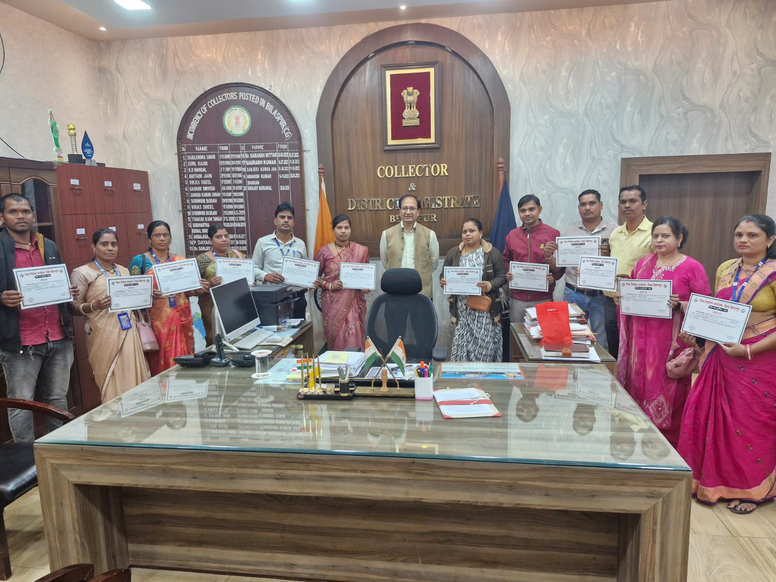 बिलासपुर // मतदाता सूचियों के गहन पुनरीक्षण कार्य में मैदानी स्तर पर कार्यरत बीएलओ का कलेक्टर संजय अग्रवाल निरंतर हौसला बढ़ा रहे है। इस क्रम में उन्होंने आज फिर 30 बीएलओ एवं अभिहित अधिकारियों को प्रशस्ति पत्र देकर सम्मानित किया। जिला निर्वाचन कार्यालय से प्राप्त जानकारी के अनुसार आज सम्मानित होने वाले बीएलओ में विधानसभा क्षेत्र तखतपुर के ग्राम चनाडोंगरी की बीएलओ श्रीमती अंजू वनराजा, साल्हेकापा की मायादेवी जायसवाल, नेवसा की अनिता ठाकुर, खठोलिया की गायत्री कश्यप, गोकुलपुर की सुनीता बघेल, गनियारी की शिल्पा वैष्णव, महुआकापा के गौरीशंकर कौशिक, टिकरी की प्रगति साहू, परसाकापा रूपमणी कश्यप, मस्तुरी विधानसभा क्षेत्र के ग्राम भगवान पाली के बीएलओ हरिचंद्र वर्मा, कुकदा के बीएलओ बजरंग प्रसाद बरेठ, देवीनारायण पटेल, श्रवण कुमार देवांगन, पकरिया की हेमलता सिंह, गतौरा के मिन्टु सांडे एवं हेमलता राठौर शामिल है। इसी प्रकार बेलतरा विधानसभा क्षेत्र के ग्राम मोहतराई के बीएलओ अशोक राव, हरदीडीह के कमलेश कुमार काछी, रेलहा की विमला, कोटा विधानसभा क्षेत्र के ग्राम रानीसागर की बीएलओ त्रिवेशी सिंह ठाकुर, कसईबहरा के अजय कुमार पैकरा, बृजभान सिंह श्याम, जोगीपुर के स्नेक मरावी, नंदेश्वरी मरावी, टेंगनमुड़ा के लक्ष्मी कोरी, खैरझिटी के कृष्णाबाई बैगा, लक्ष्मीन लहरे और जगदीश सिंह पैकरा शामिल है। इन सभी बीएलओ ने मतदाता पुनरीक्षण के अंतर्गत गणना पत्रक वितरण, पत्रक भरवाने, प्राप्त फॉर्म की पूर्ण संग्रहण और उनके ऑनलाईन एंट्री जैसे महत्वपूर्ण चरणों को दक्षता और समयबद्धता के साथ शत प्रतिशत पूरा किया।